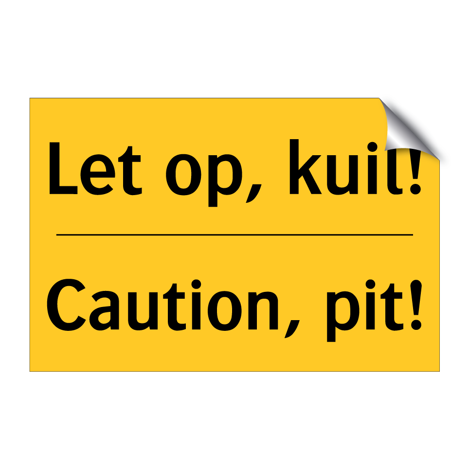 Waarschuwingsbord met de tekst Let op, kuil! / Caution, pit!