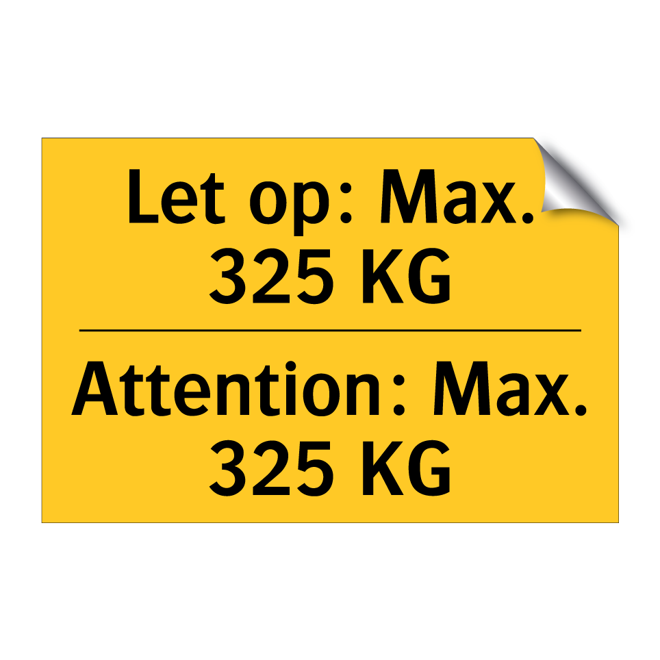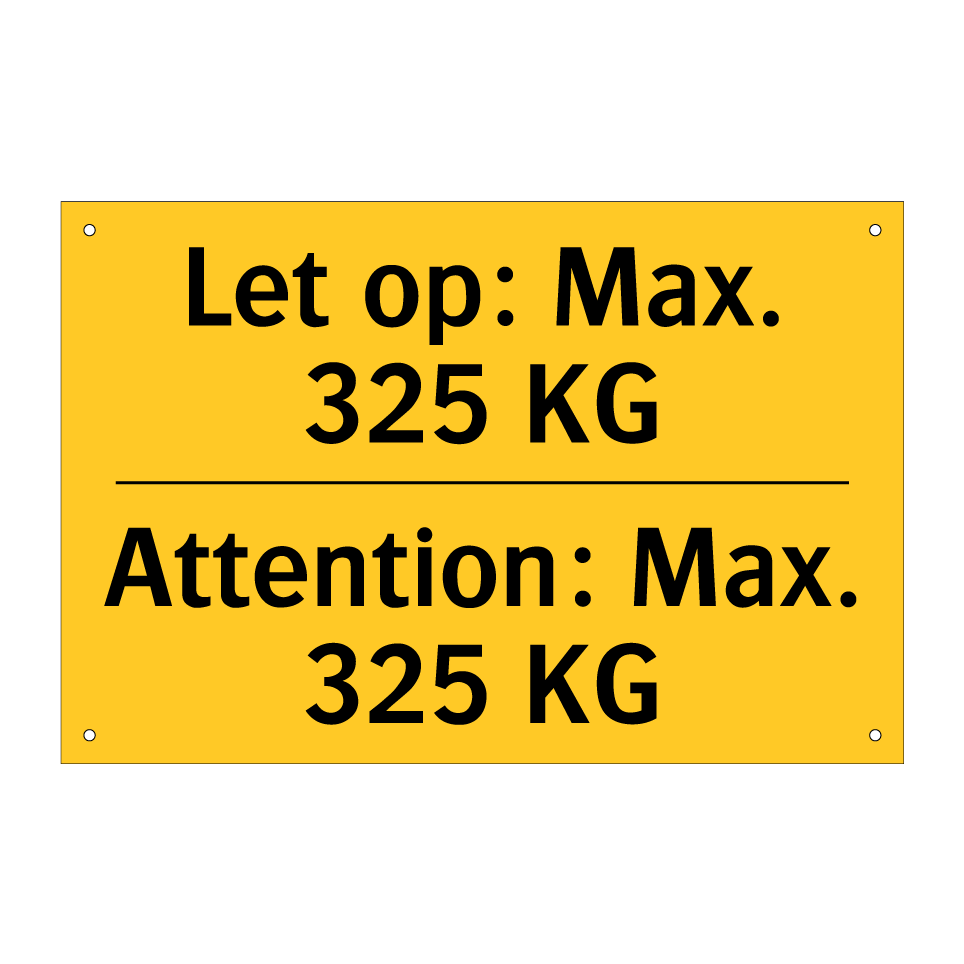 Waarschuwingsbord met de tekst Let op: Max. 325 KG / Attention: Max. 325 KG