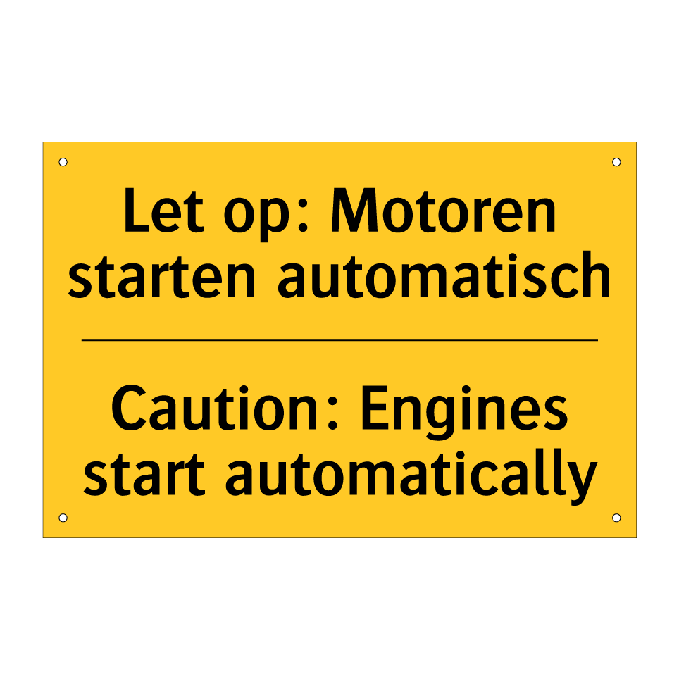 Waarschuwingsbord met de tekst Let op: Motoren starten automatisch / Caution: Engines start automatically