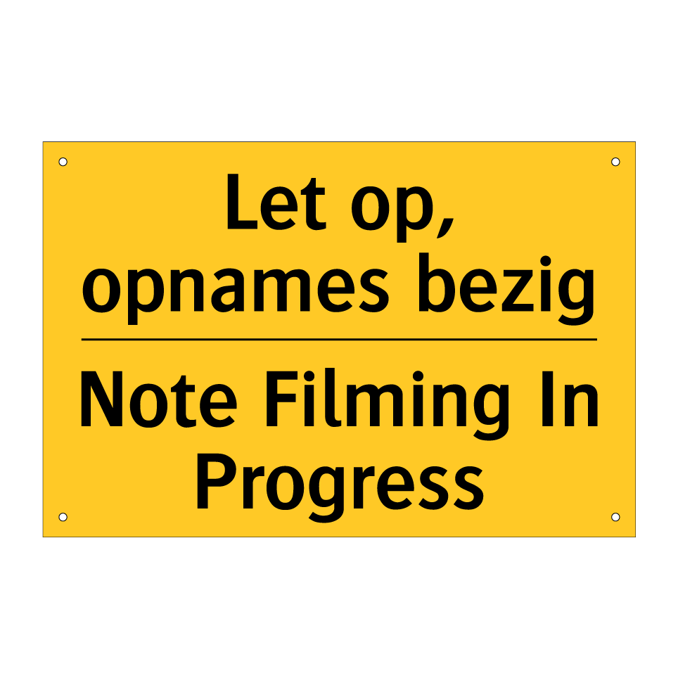 Waarschuwingsbord met de tekst Let op, opnames bezig / Note Filming In Progress