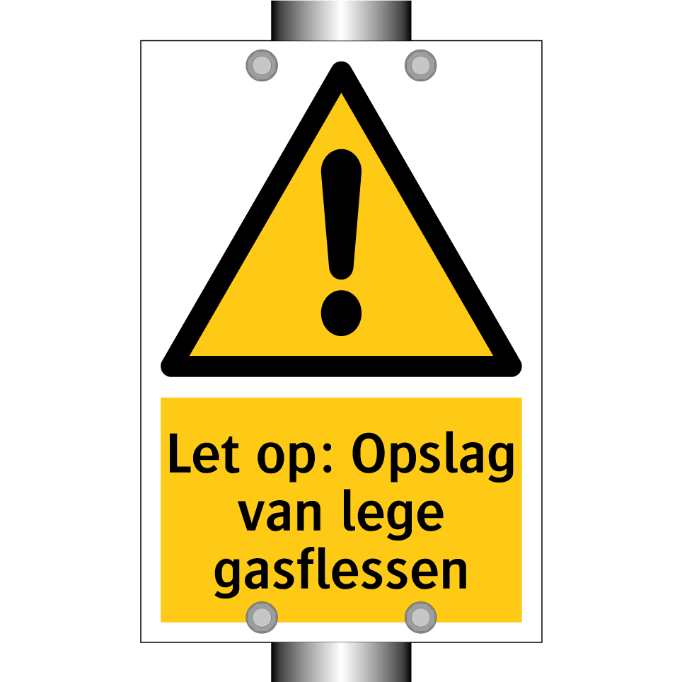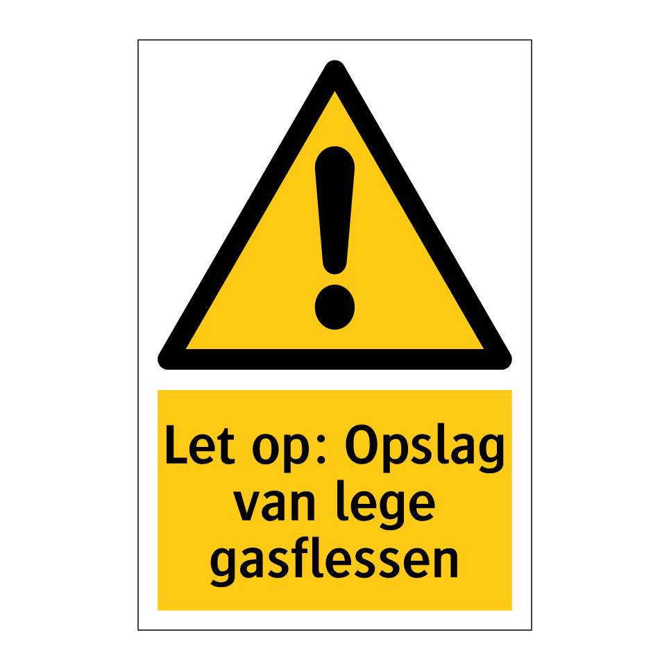 Waarschuwingsbord met de tekst Let op: Opslag van lege gasflessen