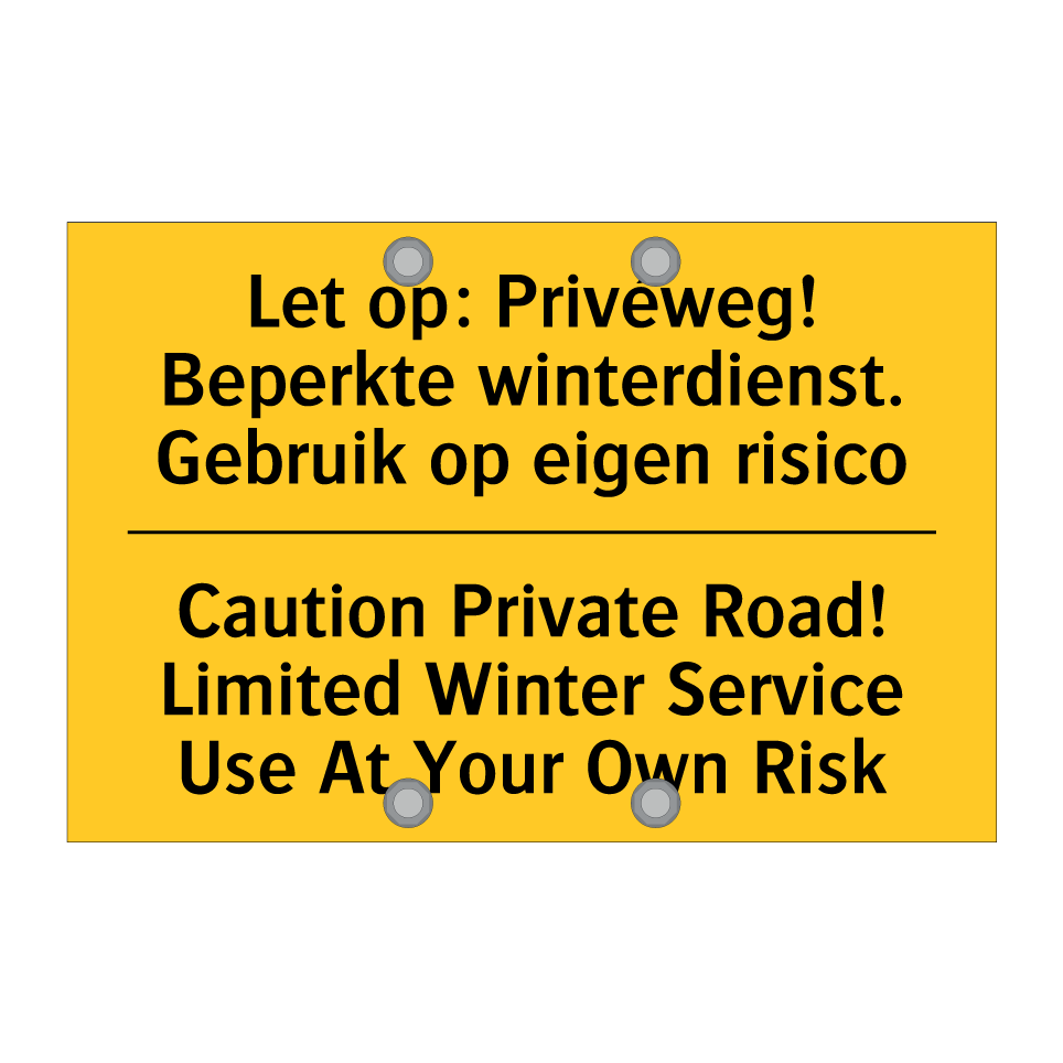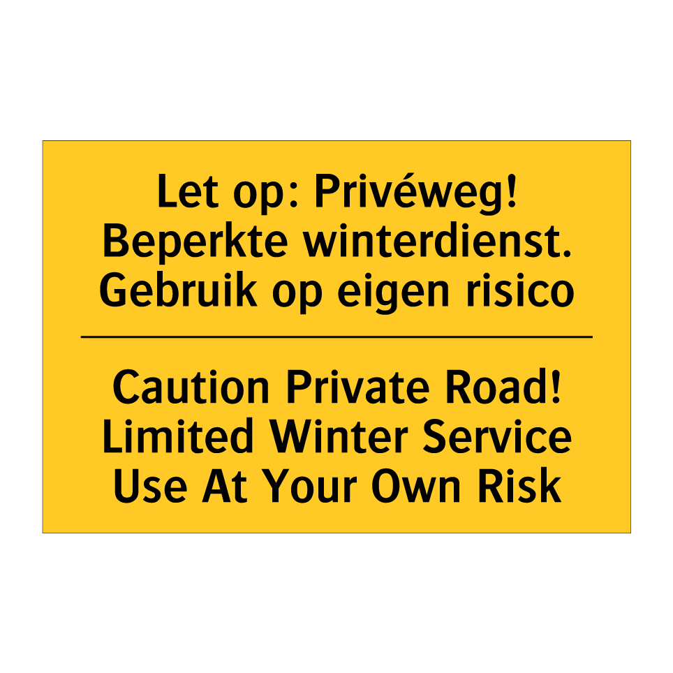 Waarschuwingsbord met de tekst Let op: Privéweg! Beperkte winterdienst. Gebruik op eigen risico / Caution Private Road! Limited Winter Service Use At Your Own Risk