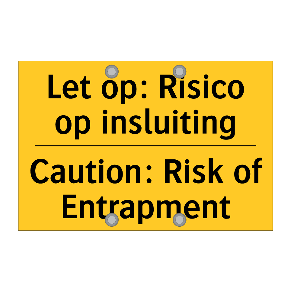 Waarschuwingsbord met de tekst Let op: Risico op insluiting / Caution: Risk of Entrapment