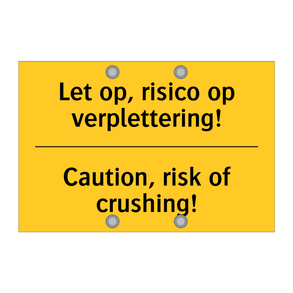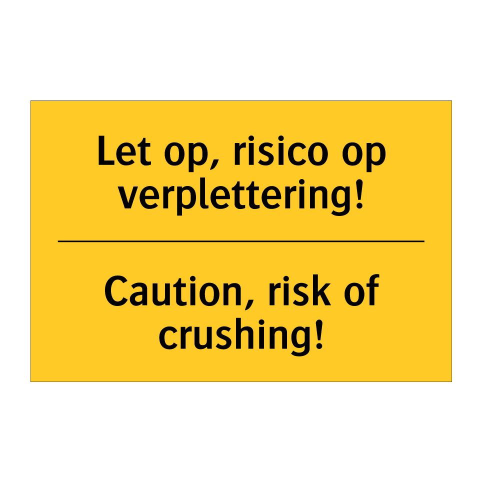 Waarschuwingsbord met de tekst Let op, risico op verplettering! / Caution, risk of crushing!