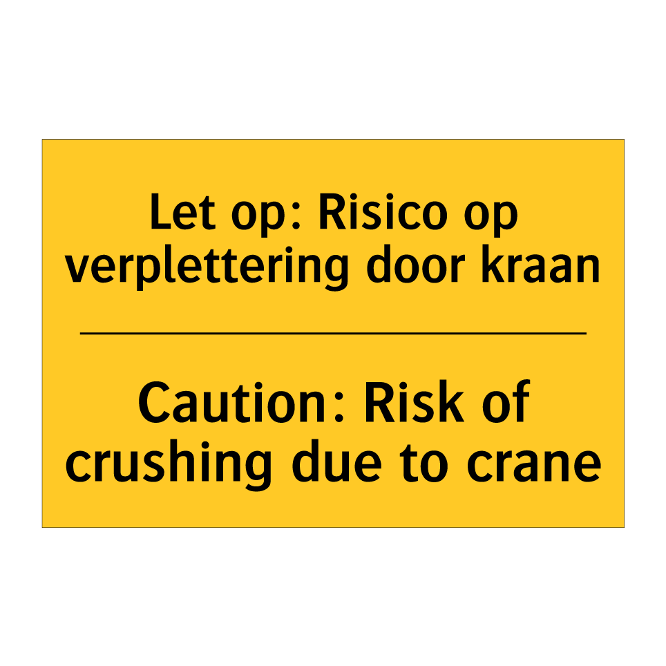 Waarschuwingsbord met de tekst Let op: Risico op verplettering door kraan / Caution: Risk of crushing due to crane