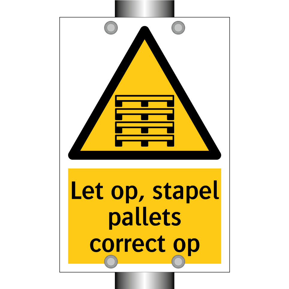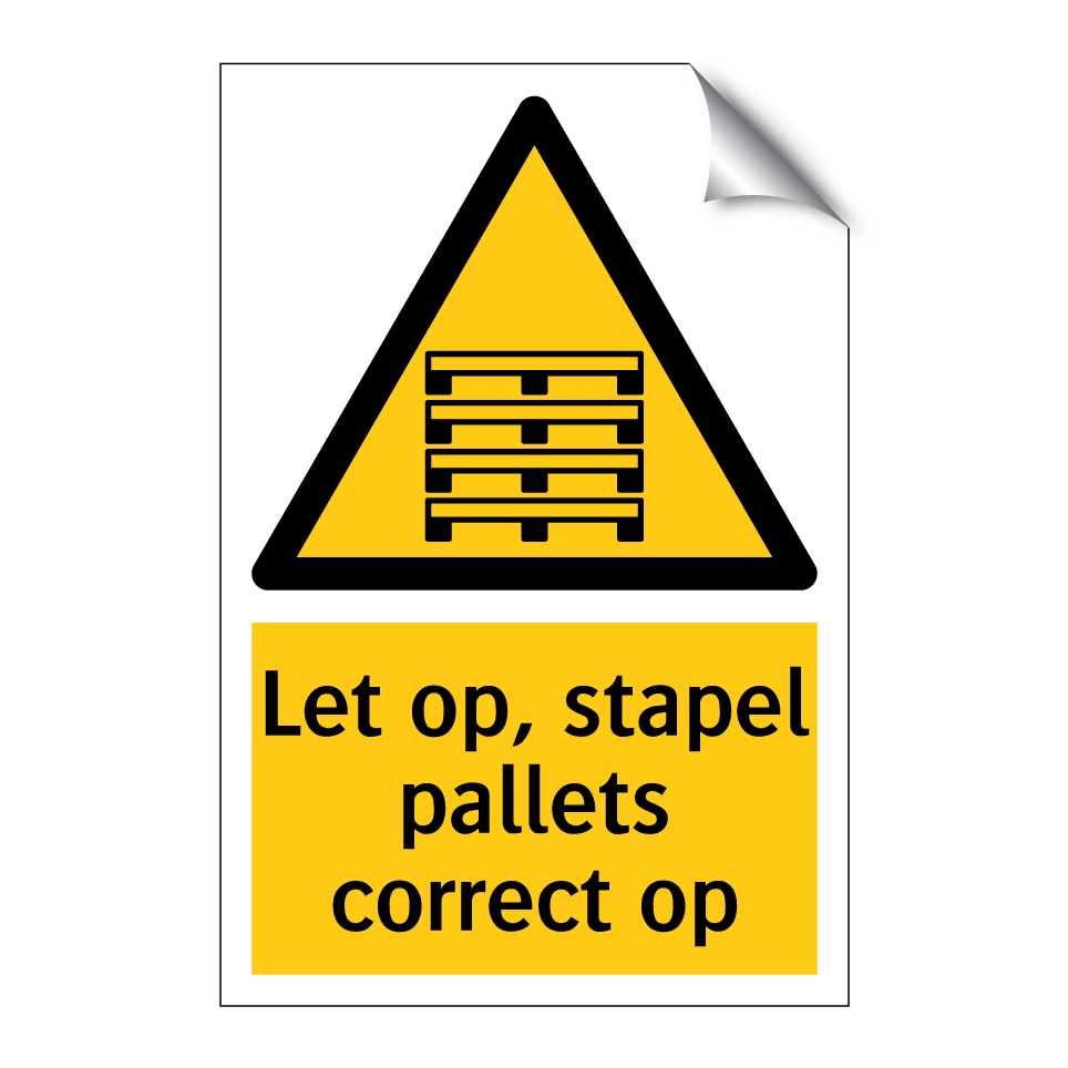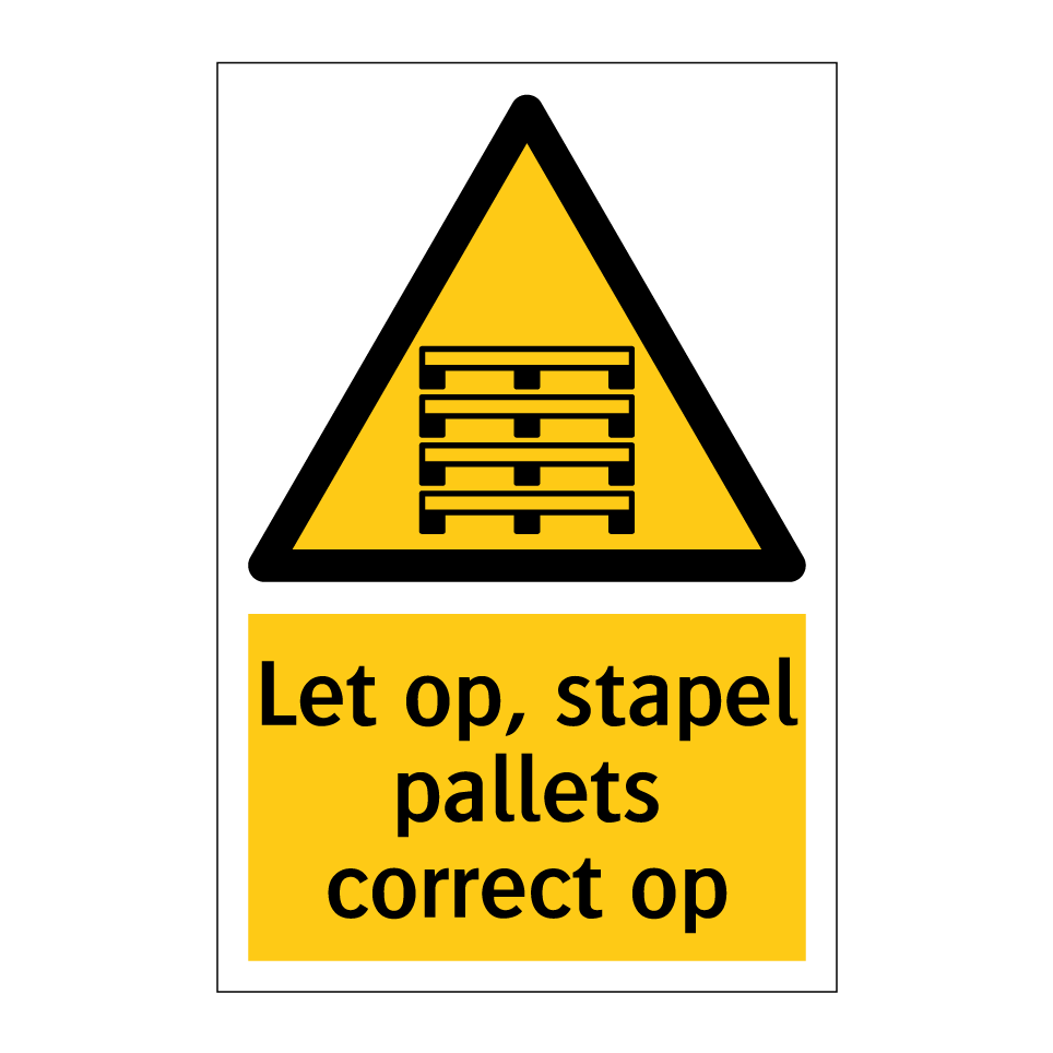 Waarschuwingsbord met de tekst Let op, stapel pallets correct op