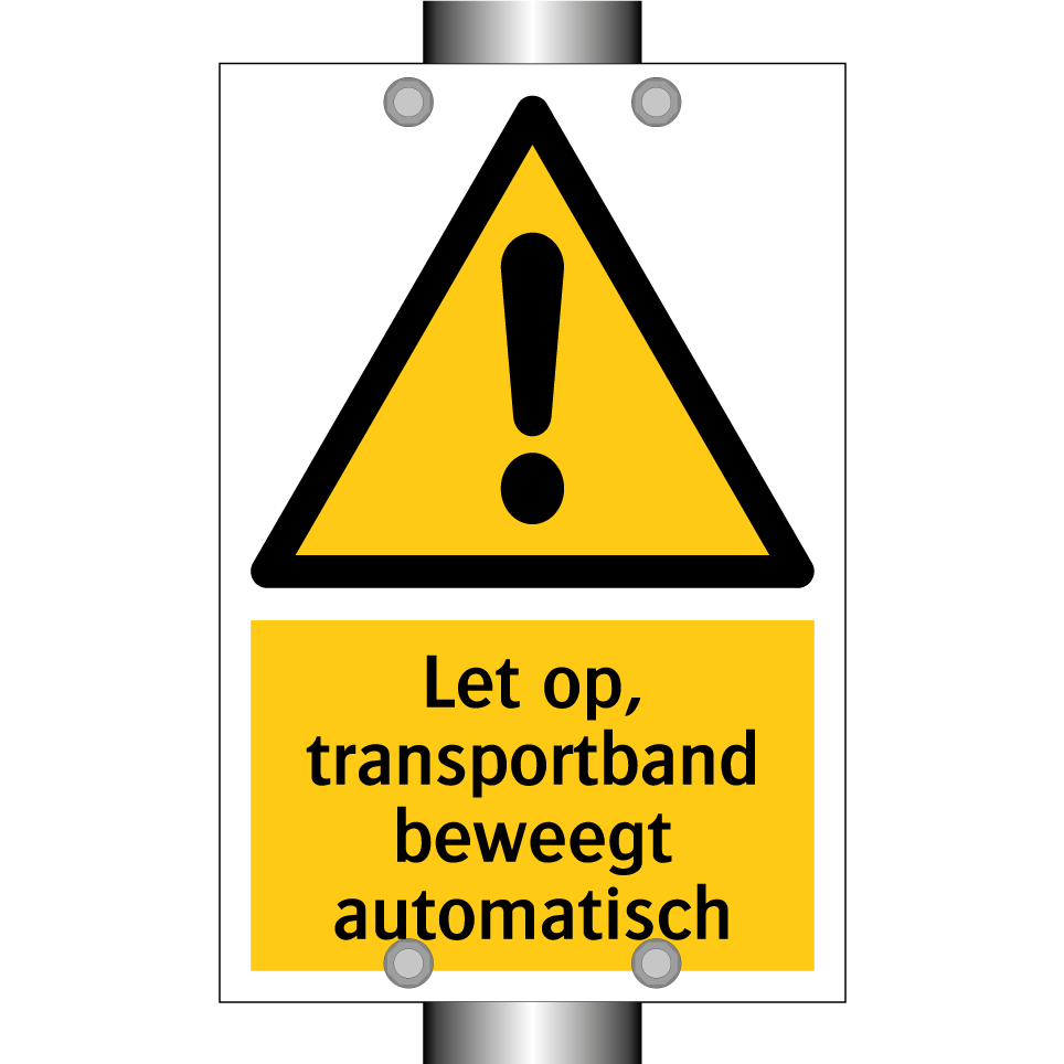 Waarschuwingsbord met de tekst Let op, transportband beweegt automatisch