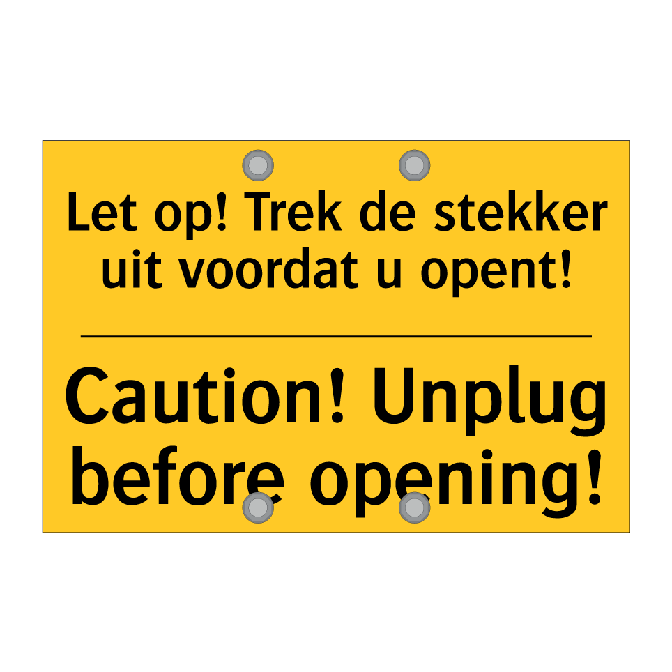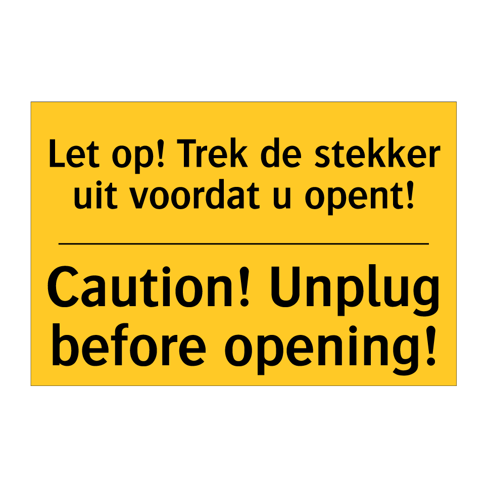 Waarschuwingsbord met de tekst Let op! Trek de stekker uit voordat u opent! / Caution! Unplug before opening!