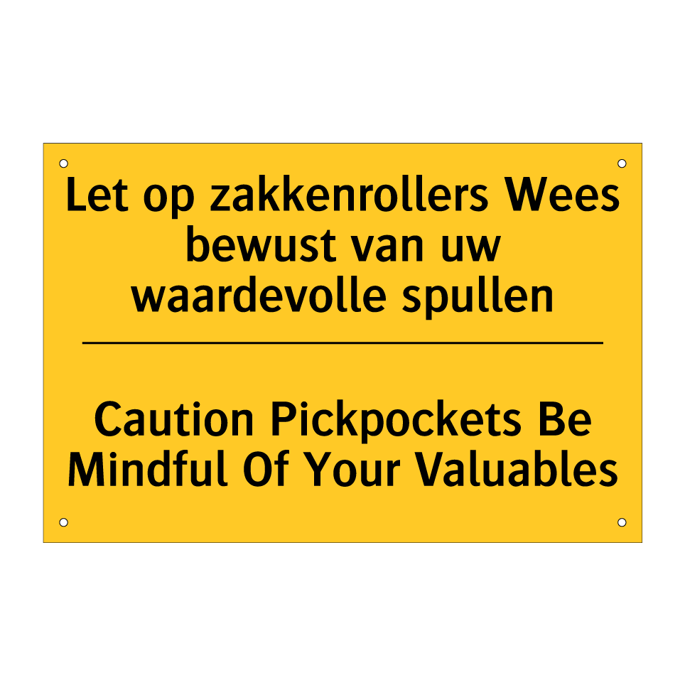 Waarschuwingsbord met de tekst Let op zakkenrollers Wees bewust van uw waardevolle spullen / Caution Pickpockets Be Mindful Of Your Valuables