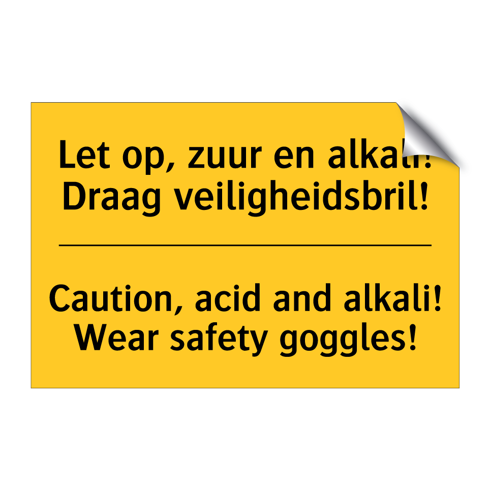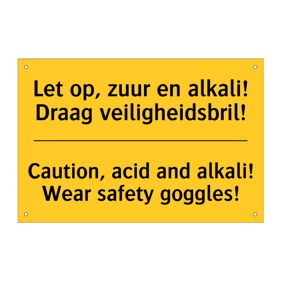 Waarschuwingsbord met de tekst Let op, zuur en alkali! Draag veiligheidsbril! / Caution, acid and alkali! Wear safety goggles!