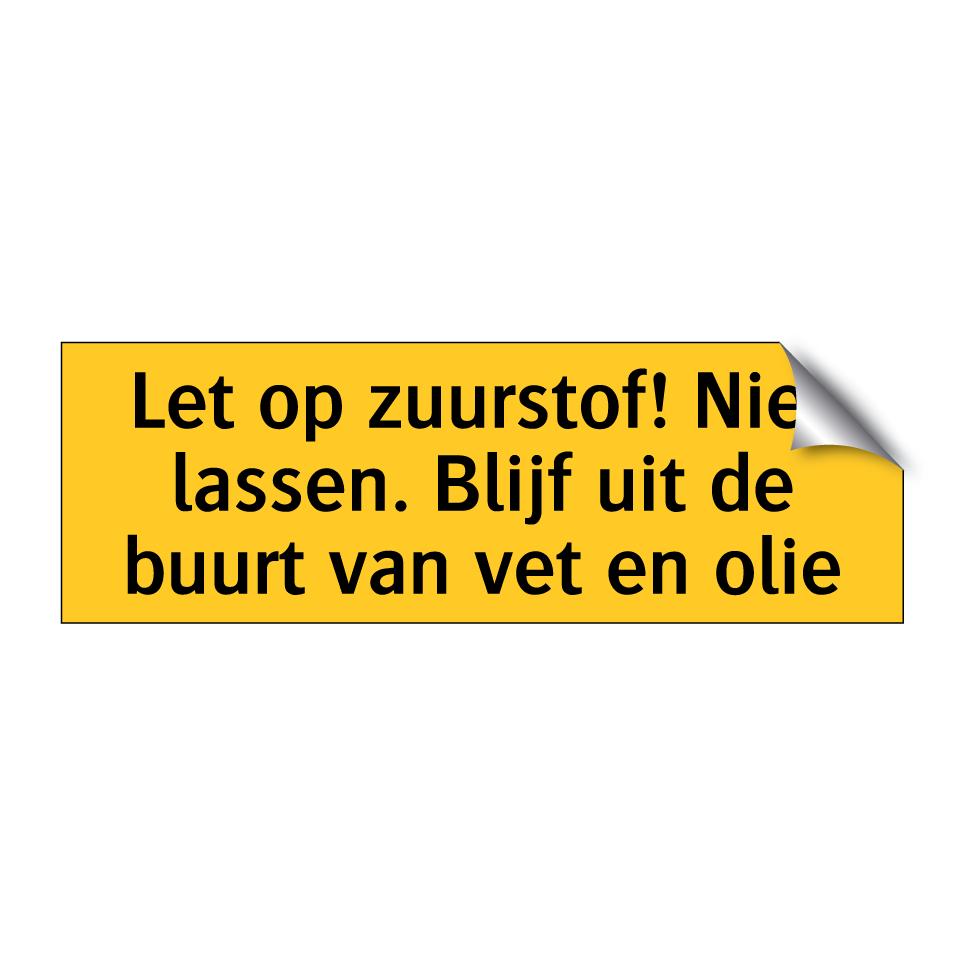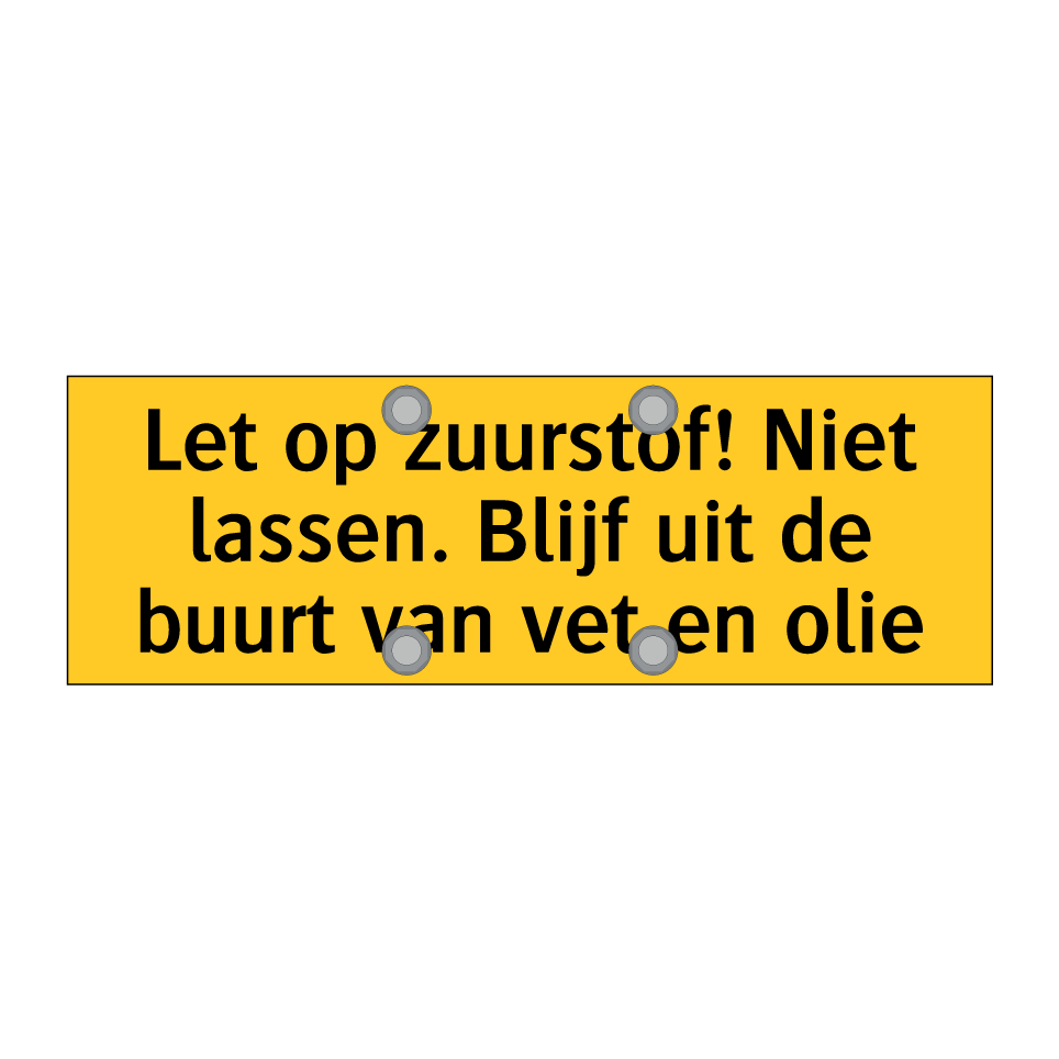 Waarschuwingsbord met de tekst Let op zuurstof! Niet lassen. Blijf uit de buurt van vet en olie