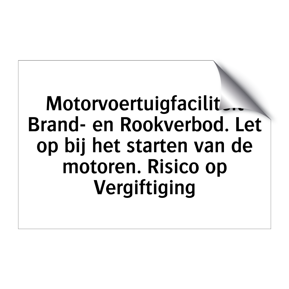 Verbodsbord met de tekst Motorvoertuigfaciliteit Brand- en Rookverbod. Let op bij het starten van de motoren. Risico op Vergiftiging