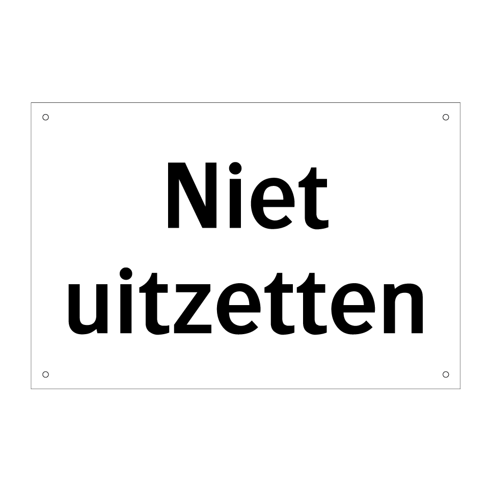 Deze verbodsbord is ideaal voor situaties waarin het essentieel is om bepaalde apparatuur of systemen continu operationeel te houden. Plaats deze duidelijke waarschuwing op strategische locaties zoals technische ruimtes, serverruimtes of bij machines die niet mogen worden uitgeschakeld. Het bord dient als een constante herinnering voor personeel en bezoekers om de werking van kritieke systemen niet te onderbreken. Door het gebruik van een heldere boodschap in het Nederlands, zorgt dit bord ervoor dat iedereen de instructie begrijpt en naleeft. Perfect voor kantoren, fabrieken en andere professionele omgevingen waar continuïteit van groot belang is.