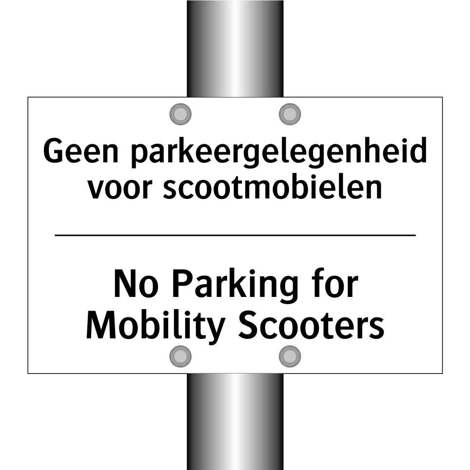 Verbodsbord met de tekst Geen parkeergelegenheid voor scootmobielen en in het Engels: No Parking for Mobility Scooters