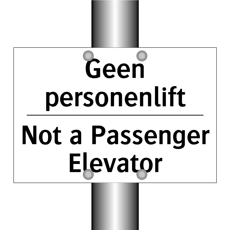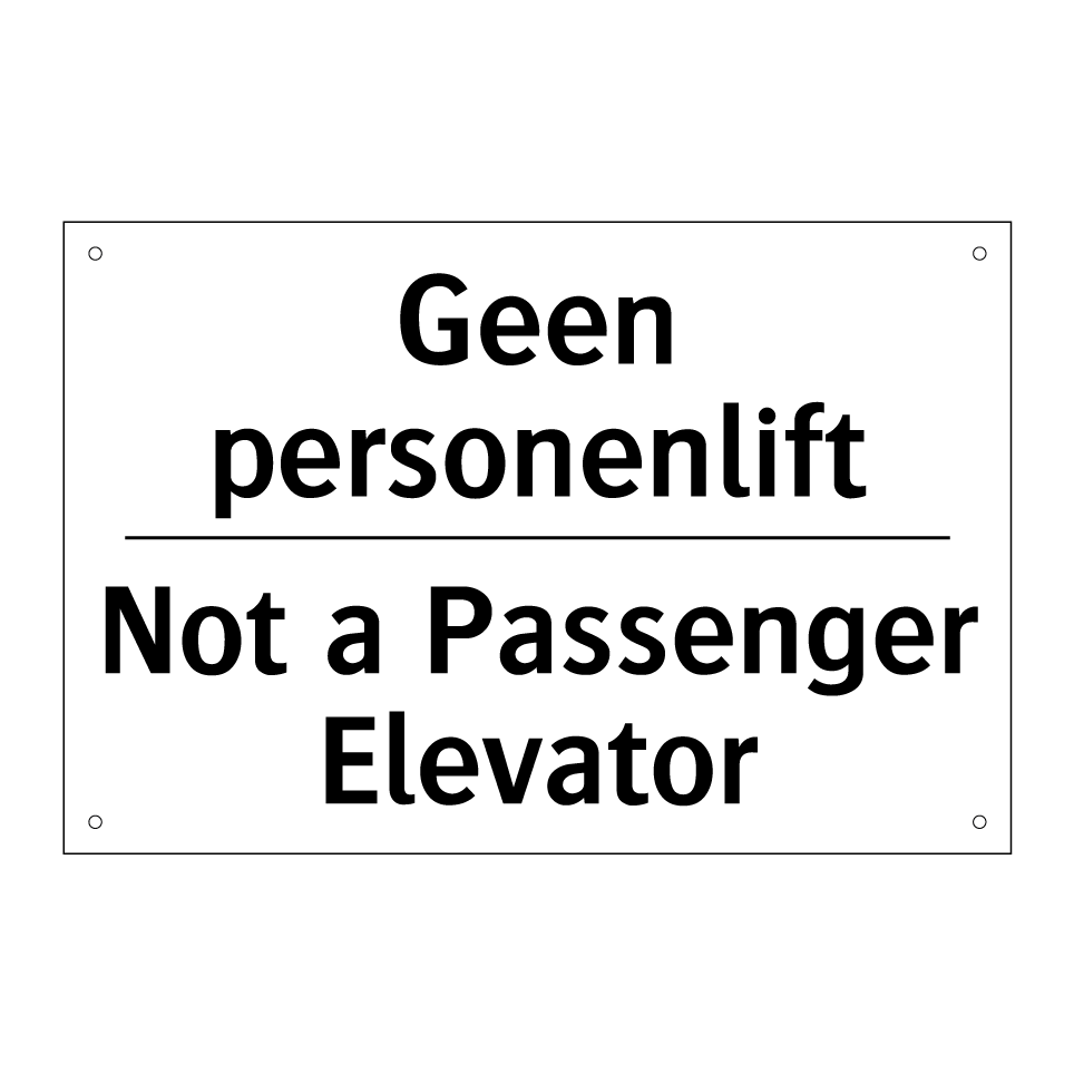 Verbodsbord met de tekst Geen personenlift en in het Engels: Not a Passenger Elevator