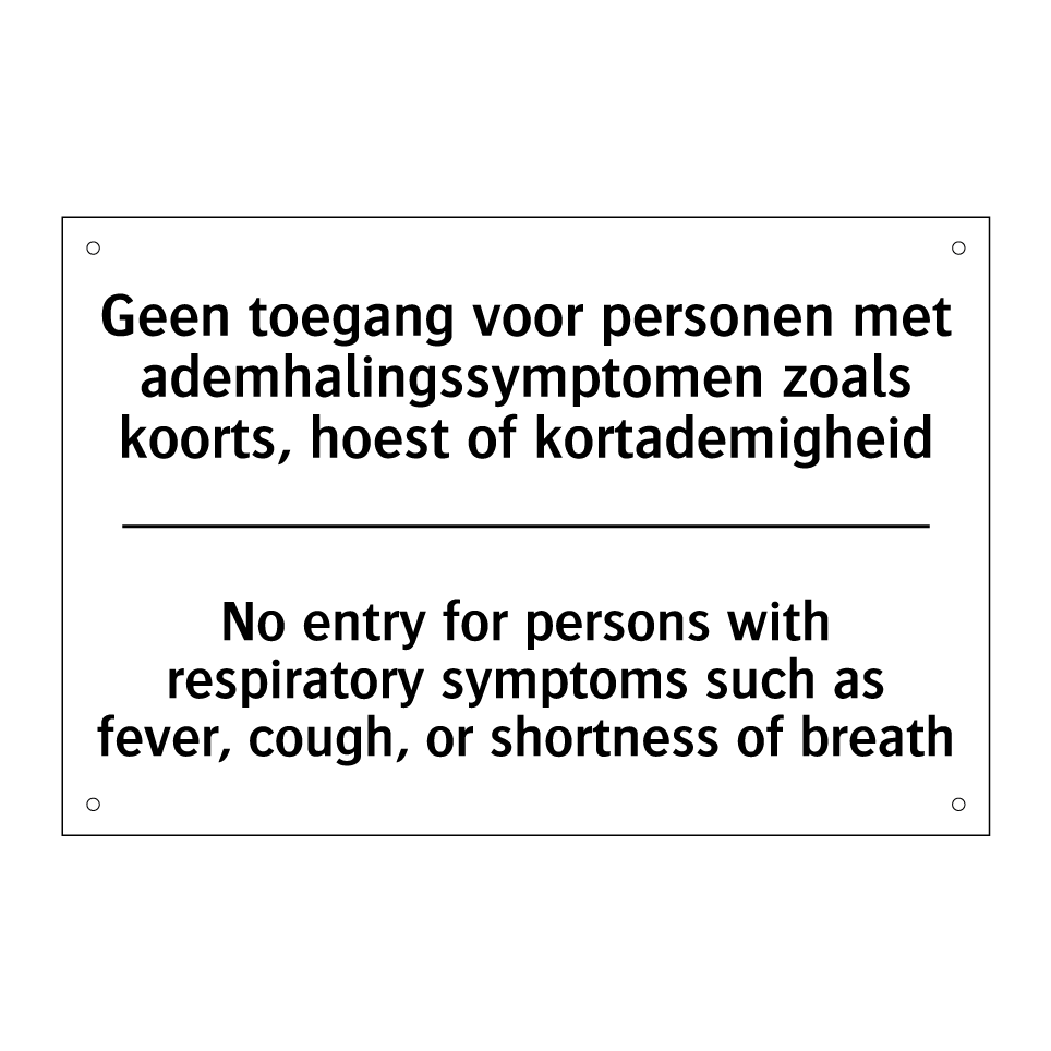 Verbodsbord met de tekst Geen toegang voor personen met ademhalingssymptomen zoals koorts, hoest of kortademigheid en in het Engels: No entry for persons with respiratory symptoms such as fever, cough, or shortness of breath