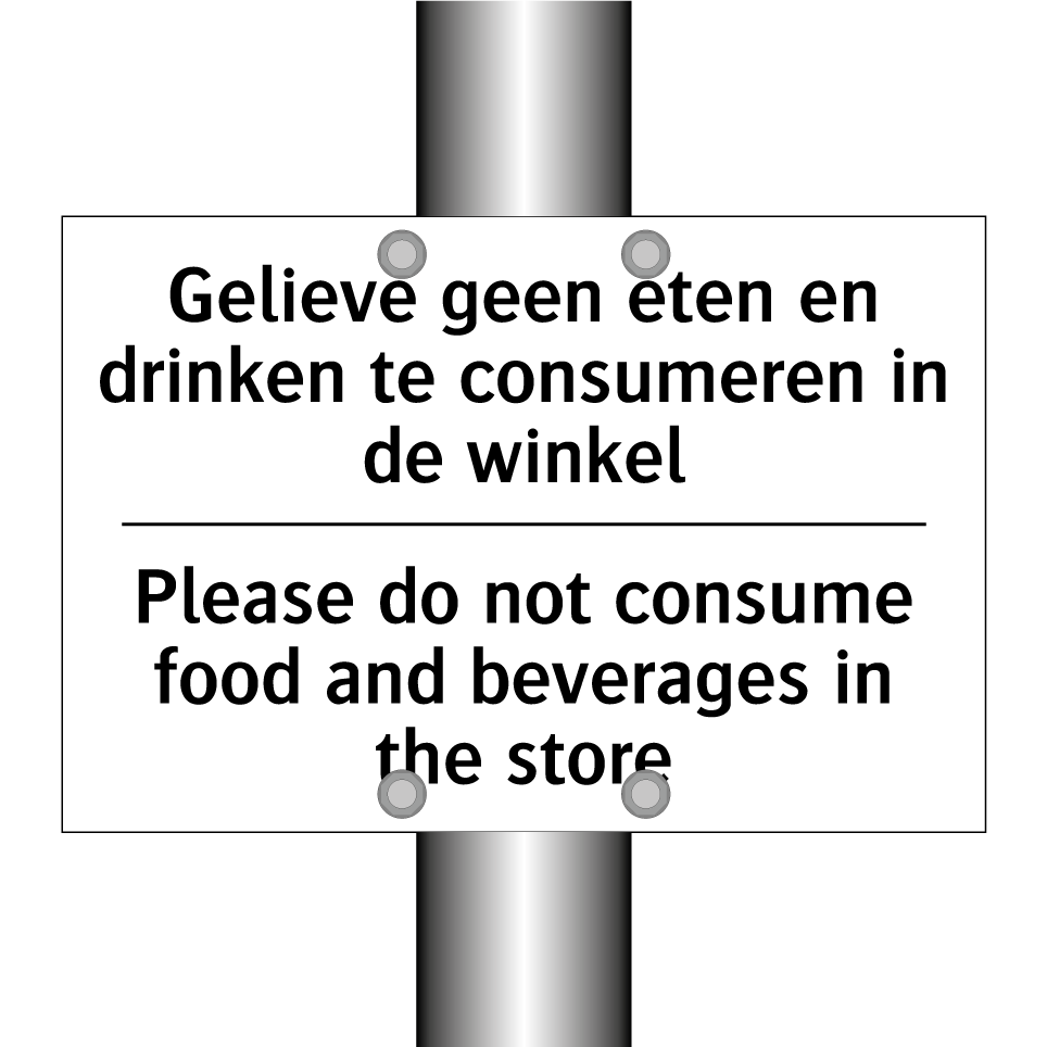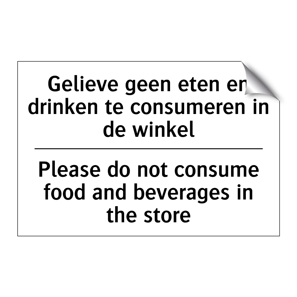 Verbodsbord met de tekst Gelieve geen eten en drinken te consumeren in de winkel en in het Engels: Please do not consume food and beverages in the store
