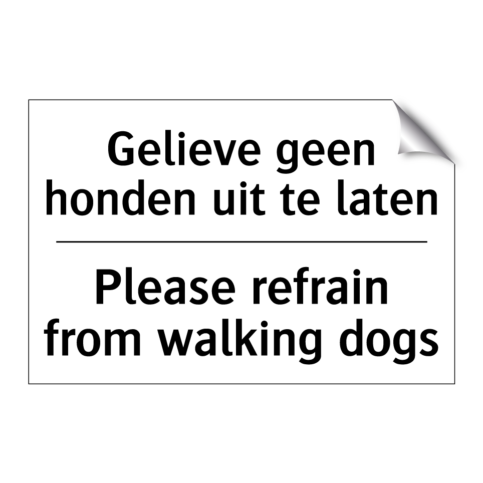 Verbodsbord met de tekst Gelieve geen honden uit te laten en in het Engels: Please refrain from walking dogs