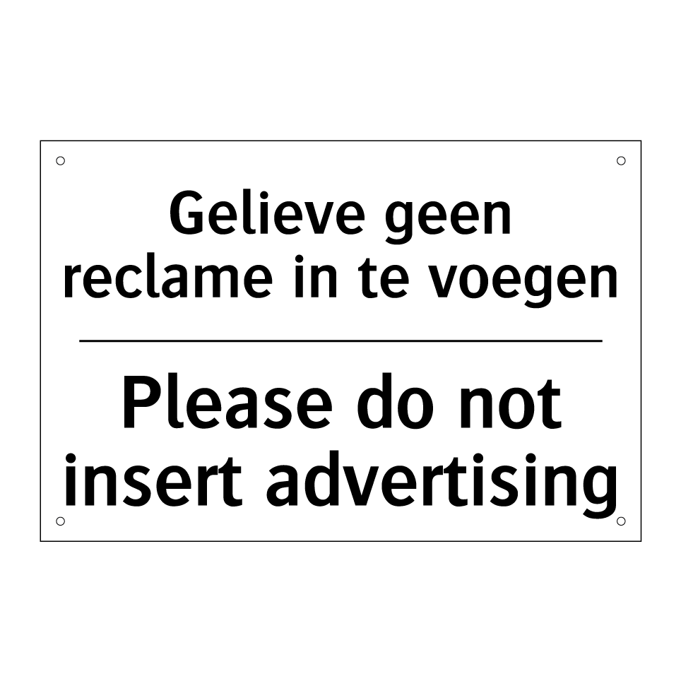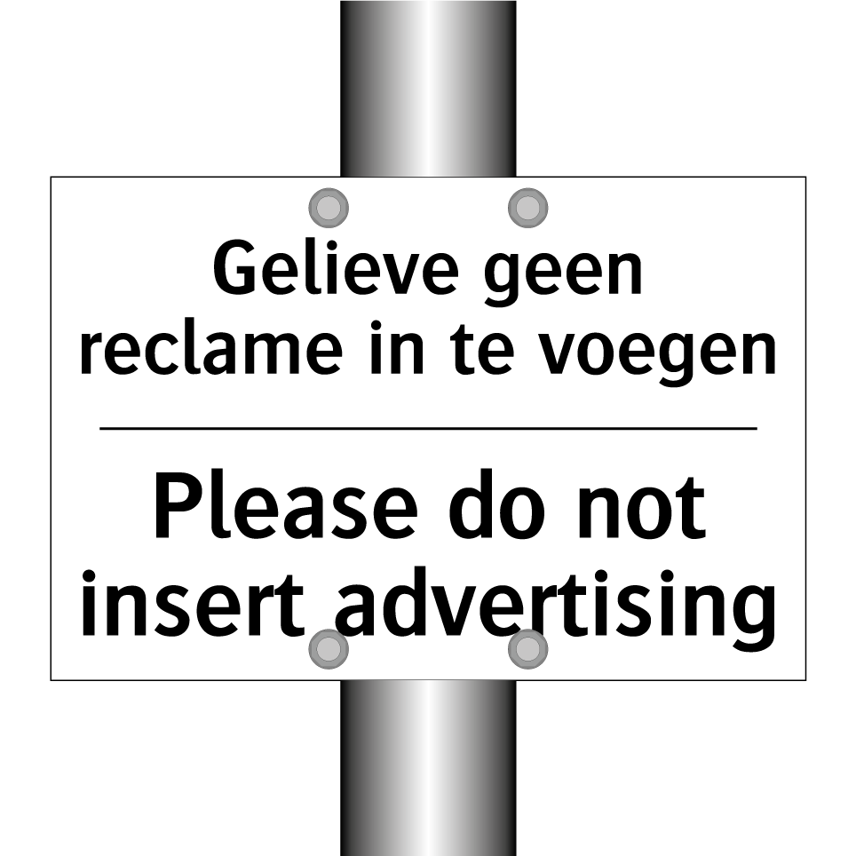 Verbodsbord met de tekst Gelieve geen reclame in te voegen en in het Engels: Please do not insert advertising