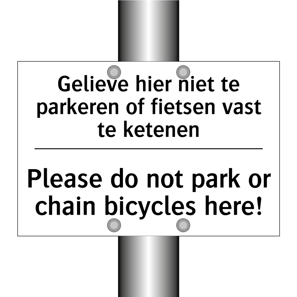 Verbodsbord met de tekst Gelieve hier niet te parkeren of fietsen vast te ketenen en in het Engels: Please do not park or chain bicycles here!
