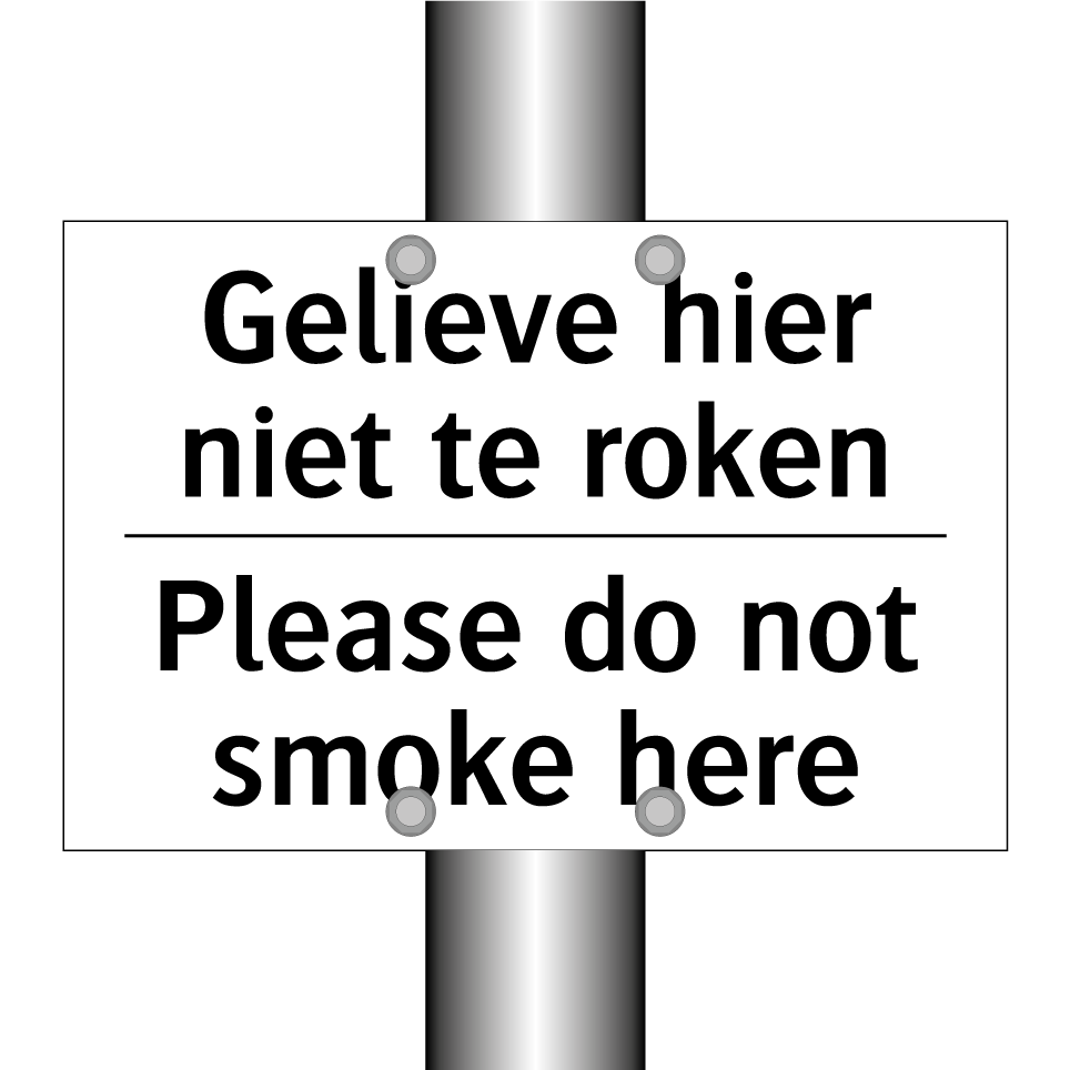Verbodsbord met de tekst Gelieve hier niet te roken en in het Engels: Please do not smoke here