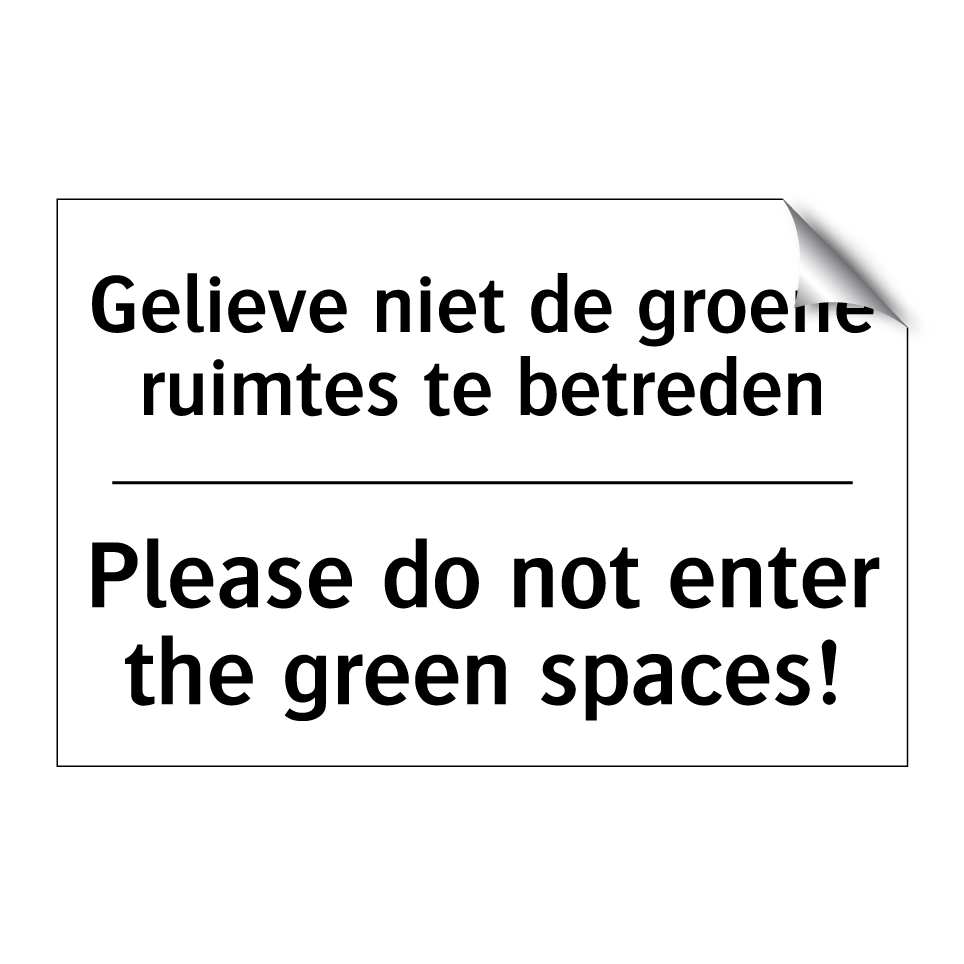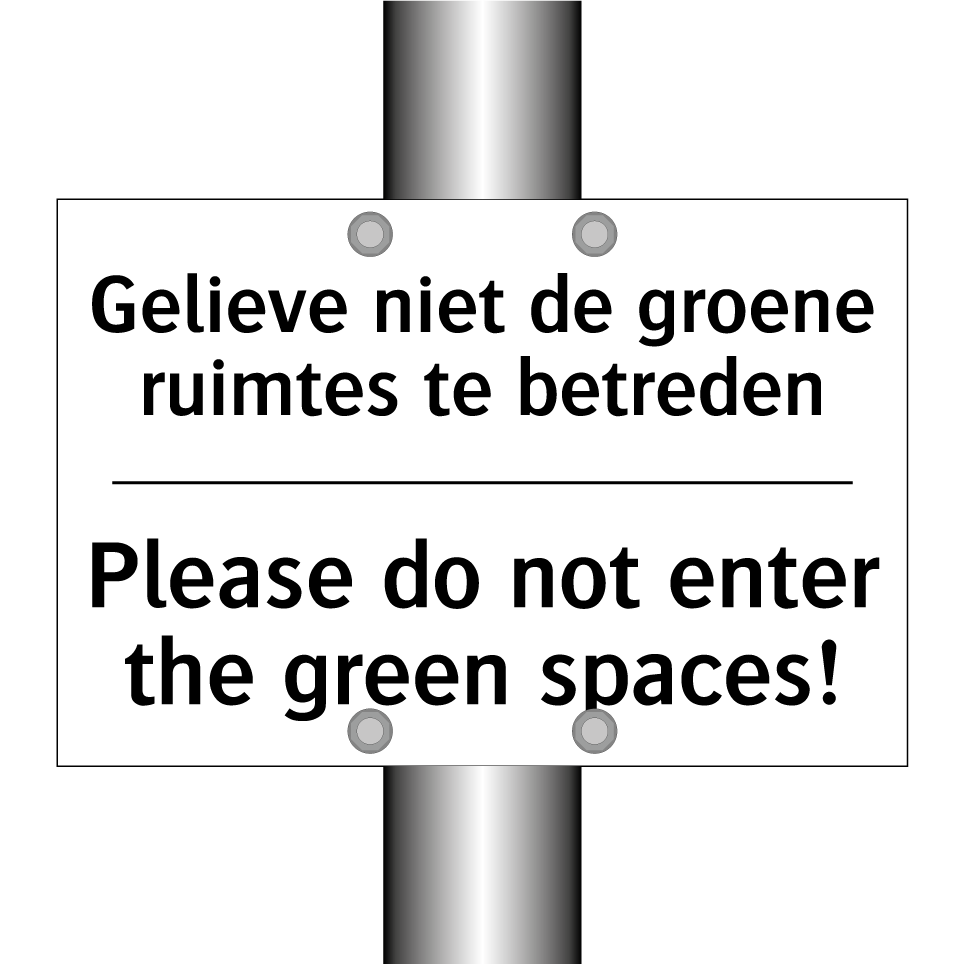 Verbodsbord met de tekst Gelieve niet de groene ruimtes te betreden en in het Engels: Please do not enter the green spaces!