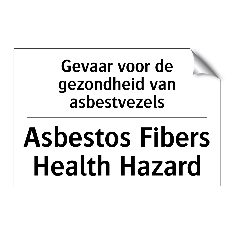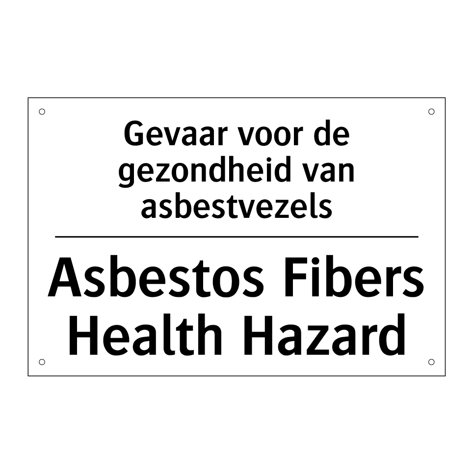 Verbodsbord met de tekst Gevaar voor de gezondheid van asbestvezels en in het Engels: Asbestos Fibers Health Hazard