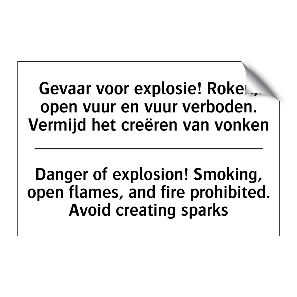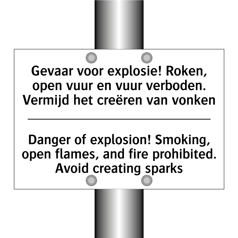 Verbodsbord met de tekst Gevaar voor explosie! Roken, open vuur en vuur verboden. Vermijd het creëren van vonken en in het Engels: Danger of explosion! Smoking, open flames, and fire prohibited. Avoid creating sparks
