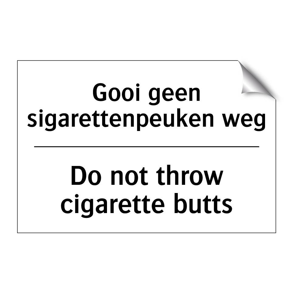 Verbodsbord met de tekst Gooi geen sigarettenpeuken weg en in het Engels: Do not throw cigarette butts