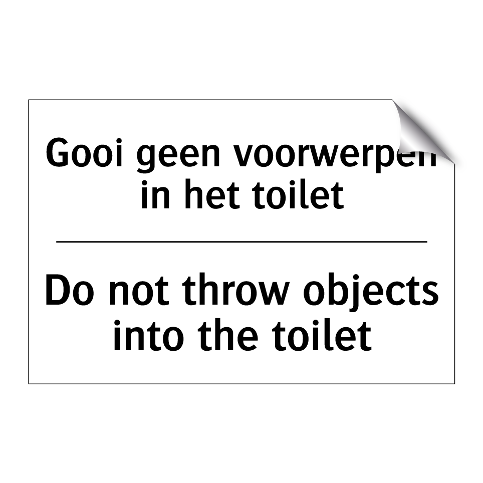 Verbodsbord met de tekst Gooi geen voorwerpen in het toilet en in het Engels: Do not throw objects into the toilet