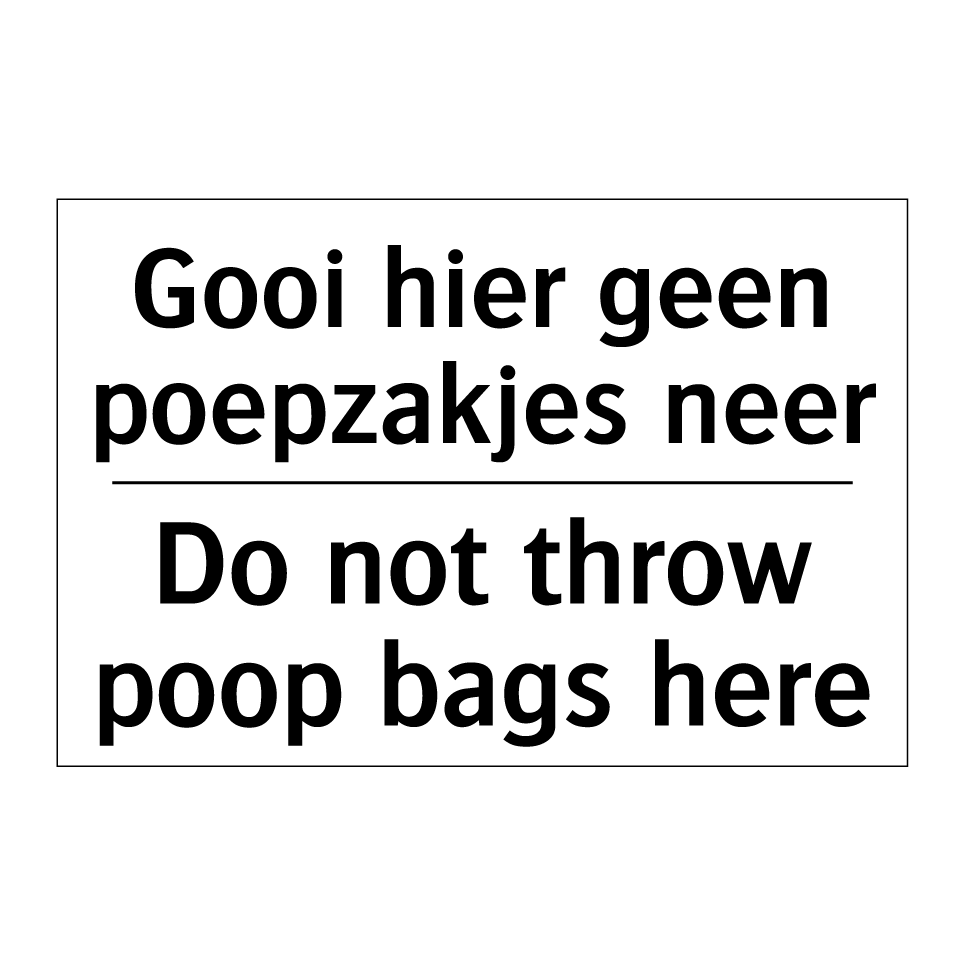 Verbodsbord met de tekst Gooi hier geen poepzakjes neer en in het Engels: Do not throw poop bags here