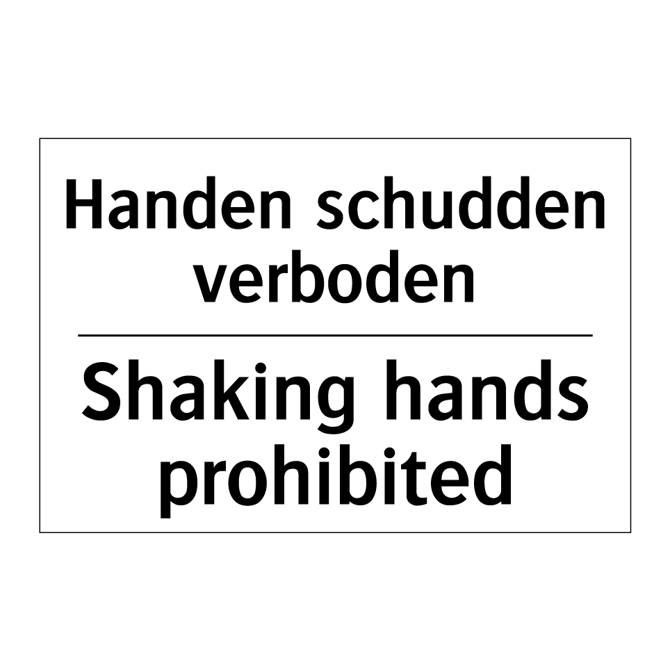 Verbodsbord met de tekst Handen schudden verboden en in het Engels: Shaking hands prohibited