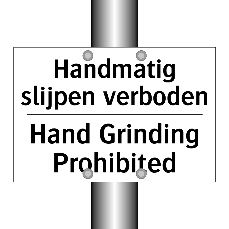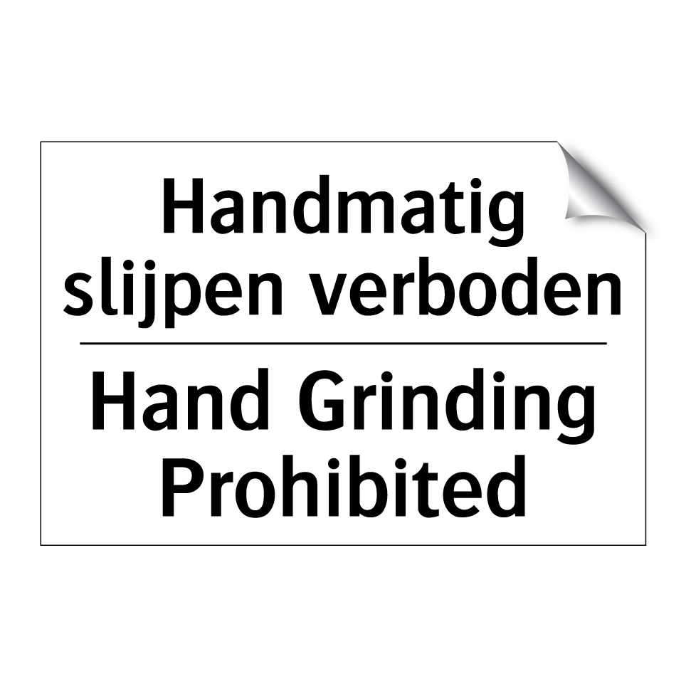 Verbodsbord met de tekst Handmatig slijpen verboden en in het Engels: Hand Grinding Prohibited