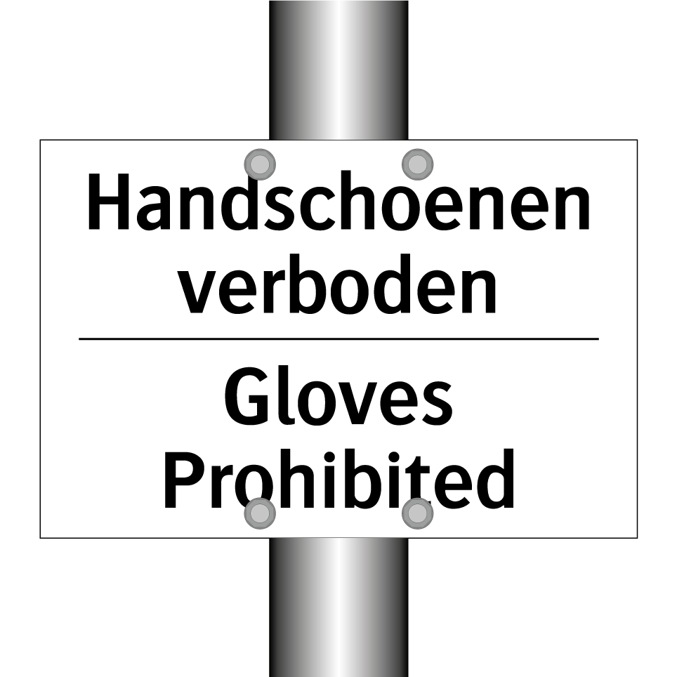 Verbodsbord met de tekst Handschoenen verboden en in het Engels: Gloves Prohibited