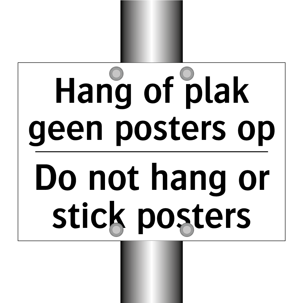 Verbodsbord met de tekst Hang of plak geen posters op en in het Engels: Do not hang or stick posters