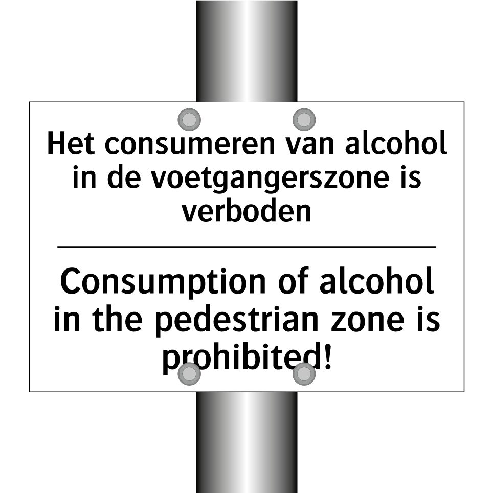 Verbodsbord met de tekst Het consumeren van alcohol in de voetgangerszone is verboden en in het Engels: Consumption of alcohol in the pedestrian zone is prohibited!