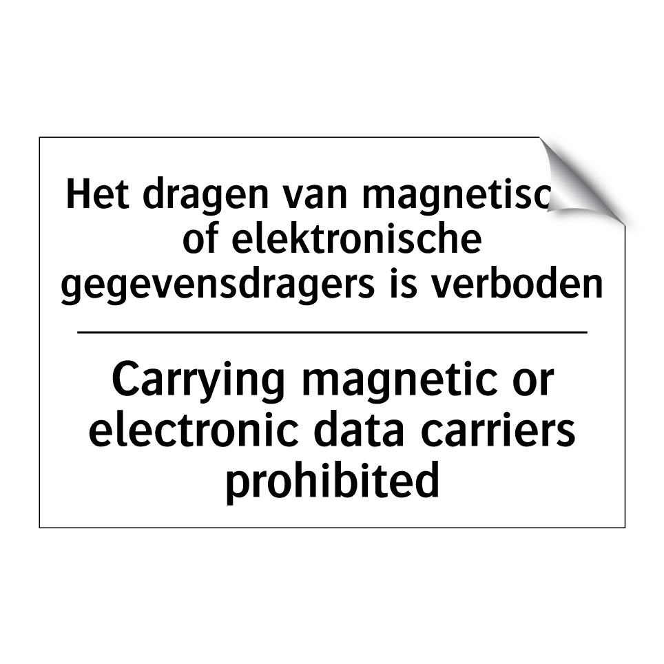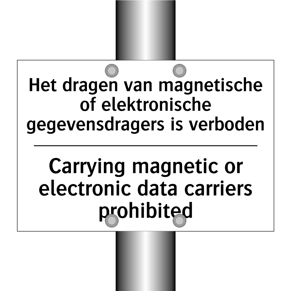 Verbodsbord met de tekst Het dragen van magnetische of elektronische gegevensdragers is verboden en in het Engels: Carrying magnetic or electronic data carriers prohibited