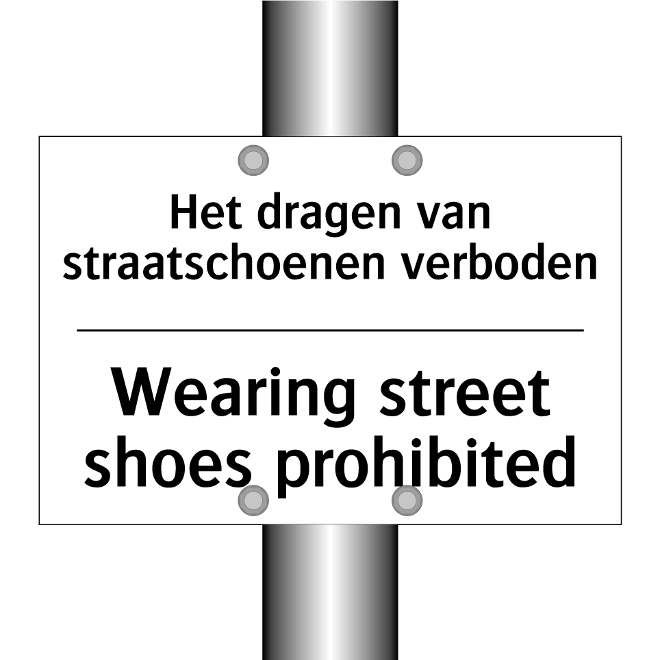 Verbodsbord met de tekst Het dragen van straatschoenen verboden en in het Engels: Wearing street shoes prohibited