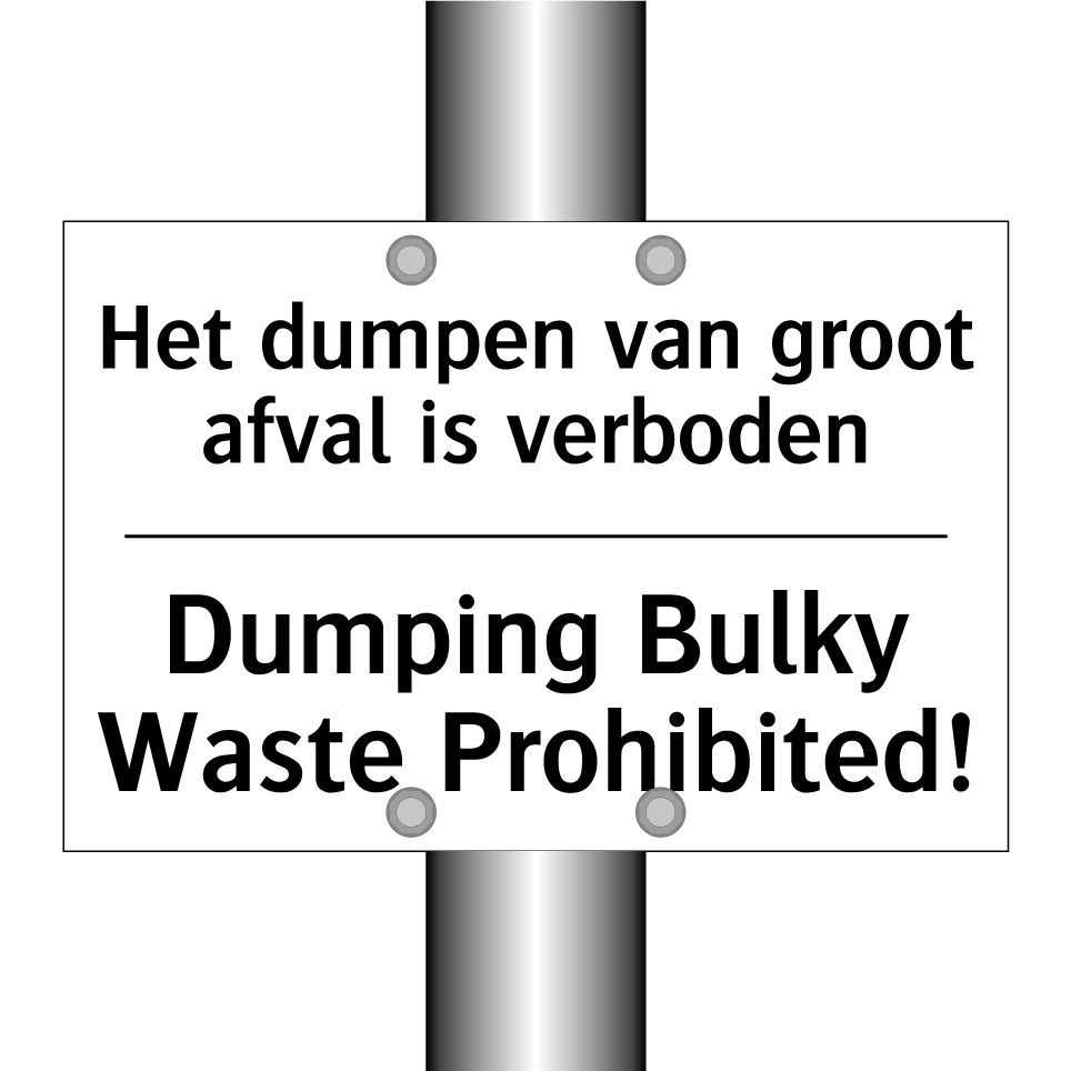 Verbodsbord met de tekst Het dumpen van groot afval is verboden en in het Engels: Dumping Bulky Waste Prohibited!