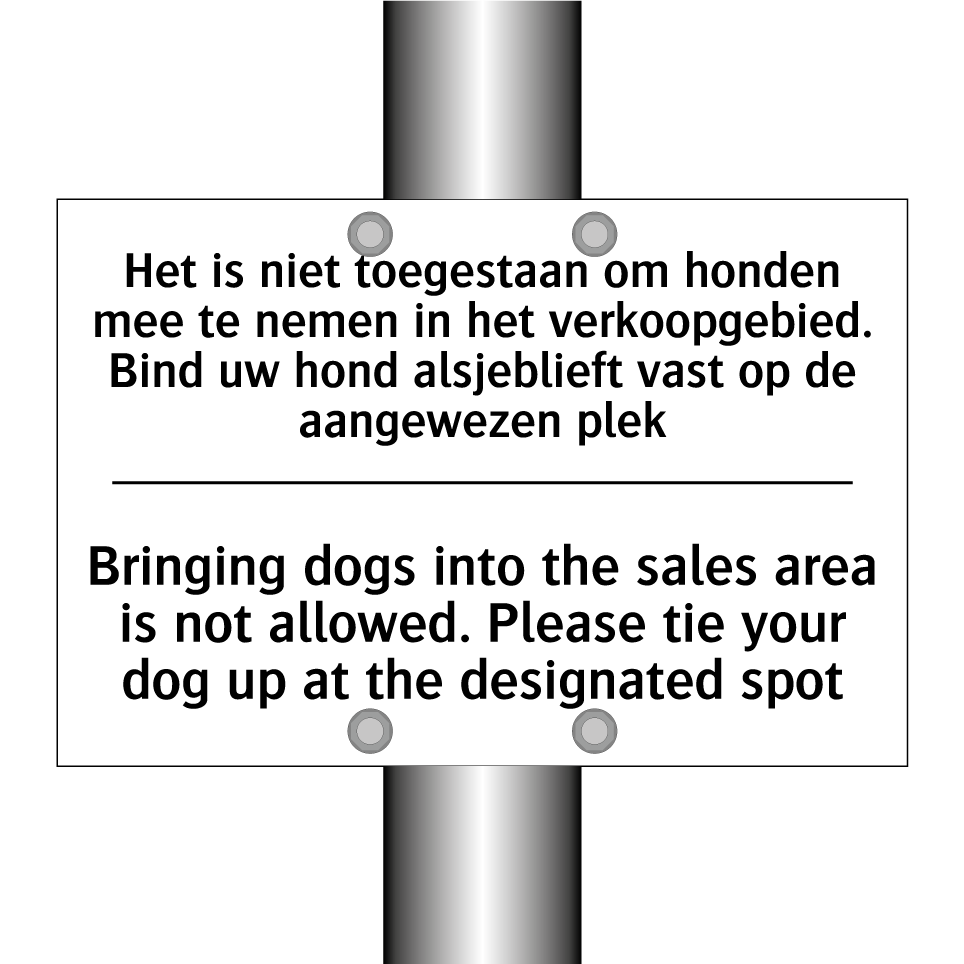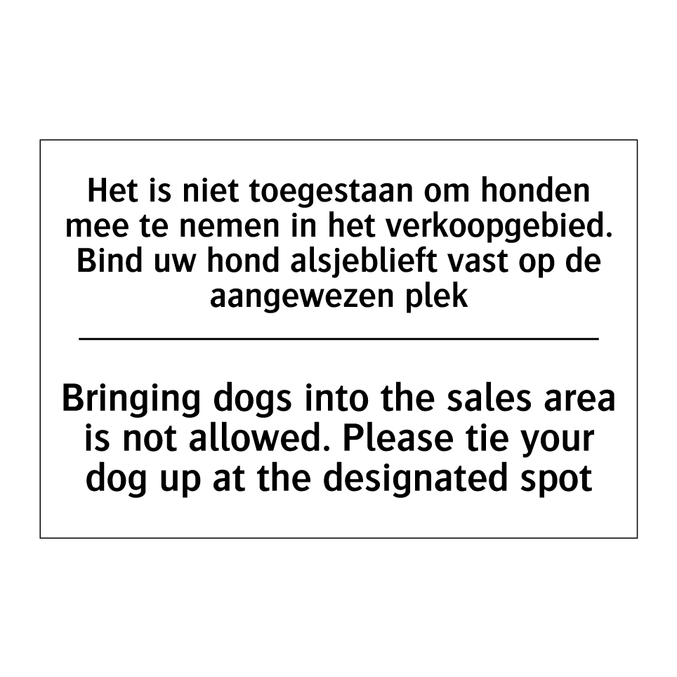 Verbodsbord met de tekst Het is niet toegestaan om honden mee te nemen in het verkoopgebied. Bind uw hond alsjeblieft vast op de aangewezen plek en in het Engels: Bringing dogs into the sales area is not allowed. Please tie your dog up at the designated spot