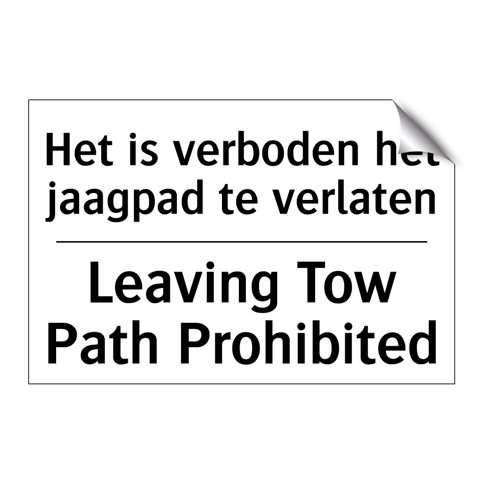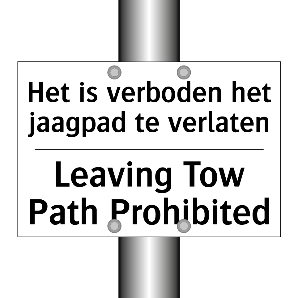 Verbodsbord met de tekst Het is verboden het jaagpad te verlaten en in het Engels: Leaving Tow Path Prohibited