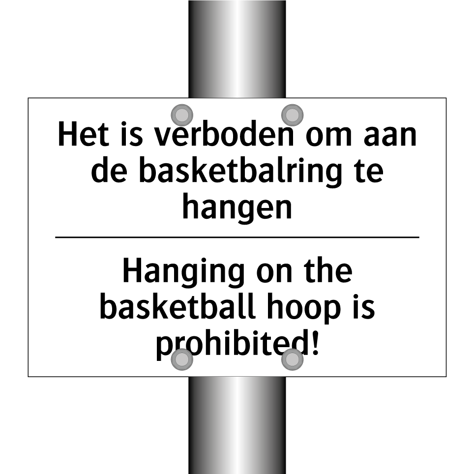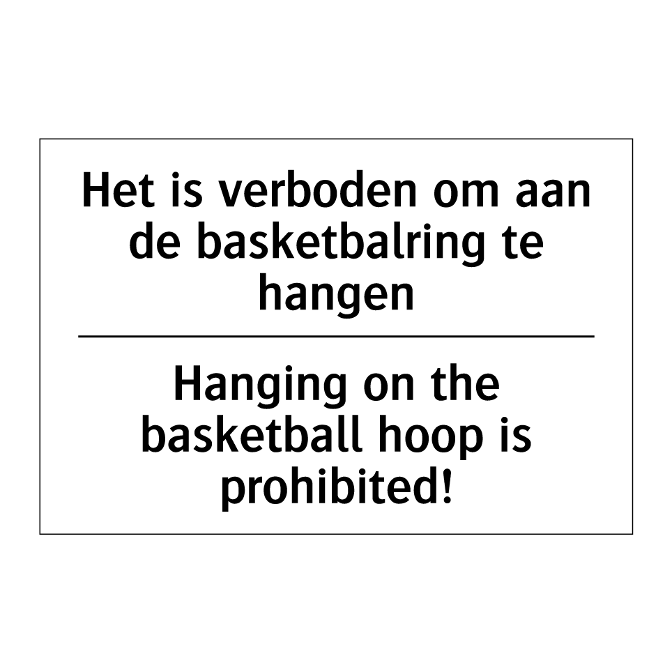 Verbodsbord met de tekst Het is verboden om aan de basketbalring te hangen en in het Engels: Hanging on the basketball hoop is prohibited!