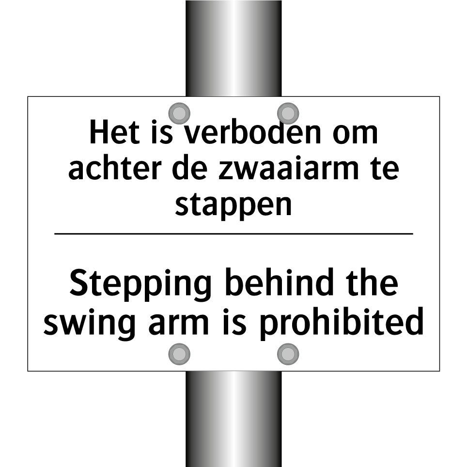 Verbodsbord met de tekst Het is verboden om achter de zwaaiarm te stappen en in het Engels: Stepping behind the swing arm is prohibited