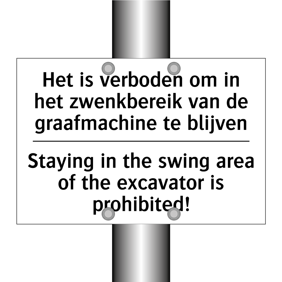 Verbodsbord met de tekst Het is verboden om in het zwenkbereik van de graafmachine te blijven en in het Engels: Staying in the swing area of the excavator is prohibited!
