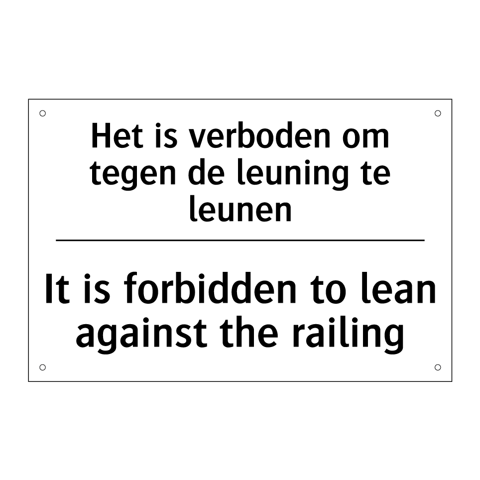 Verbodsbord met de tekst Het is verboden om tegen de leuning te leunen en in het Engels: It is forbidden to lean against the railing