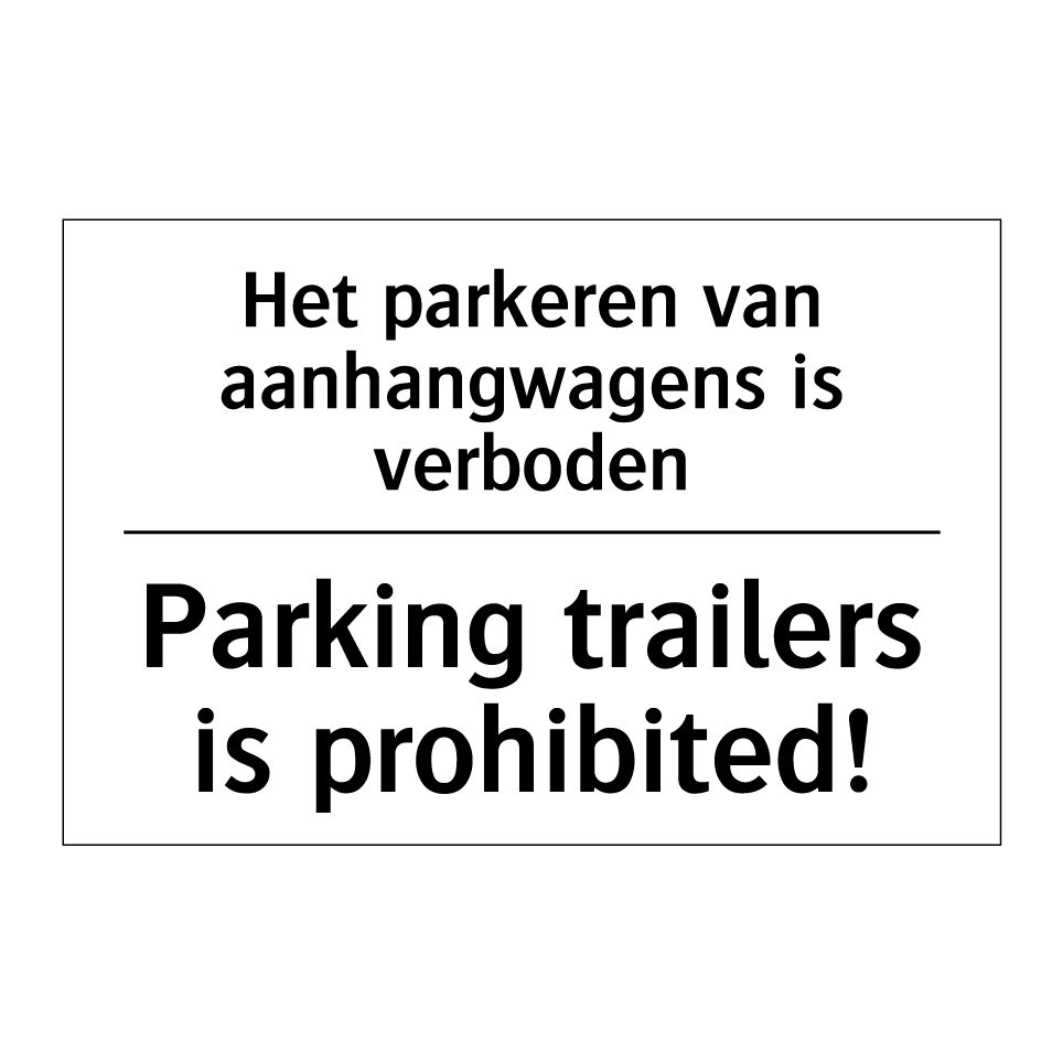 Verbodsbord met de tekst Het parkeren van aanhangwagens is verboden en in het Engels: Parking trailers is prohibited!