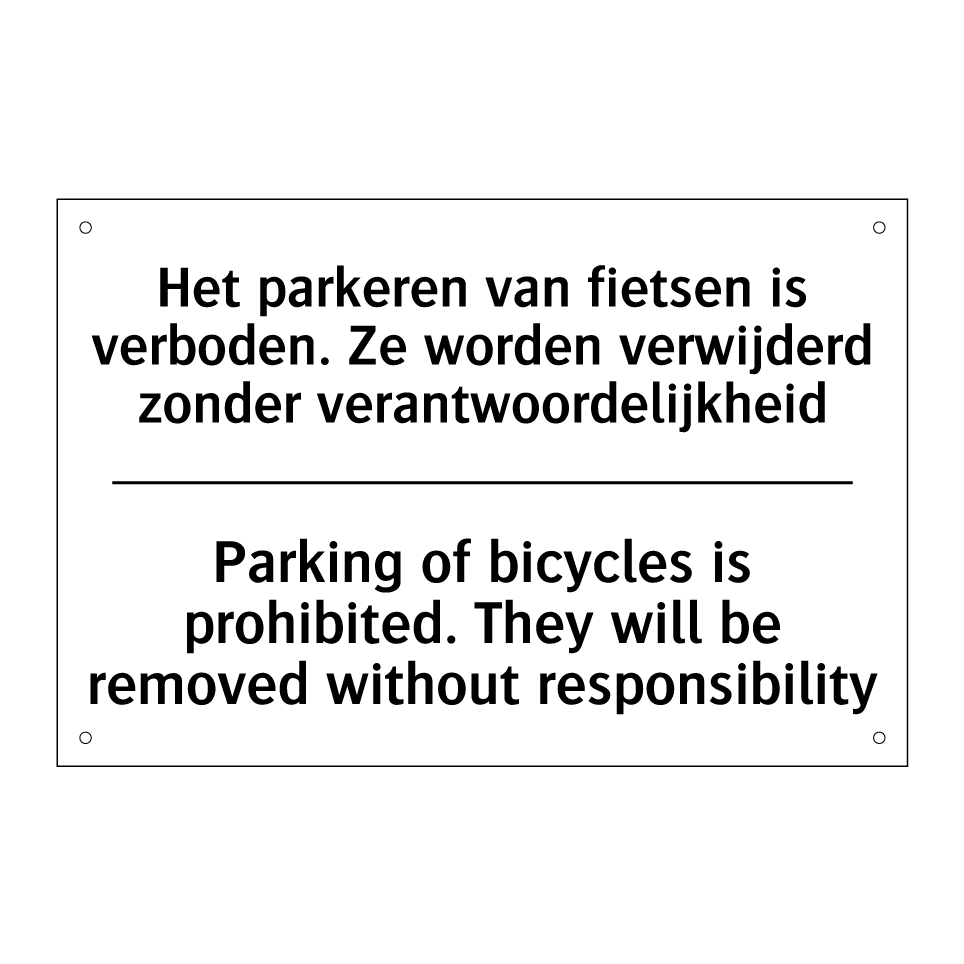 Verbodsbord met de tekst Het parkeren van fietsen is verboden. Ze worden verwijderd zonder verantwoordelijkheid en in het Engels: Parking of bicycles is prohibited. They will be removed without responsibility