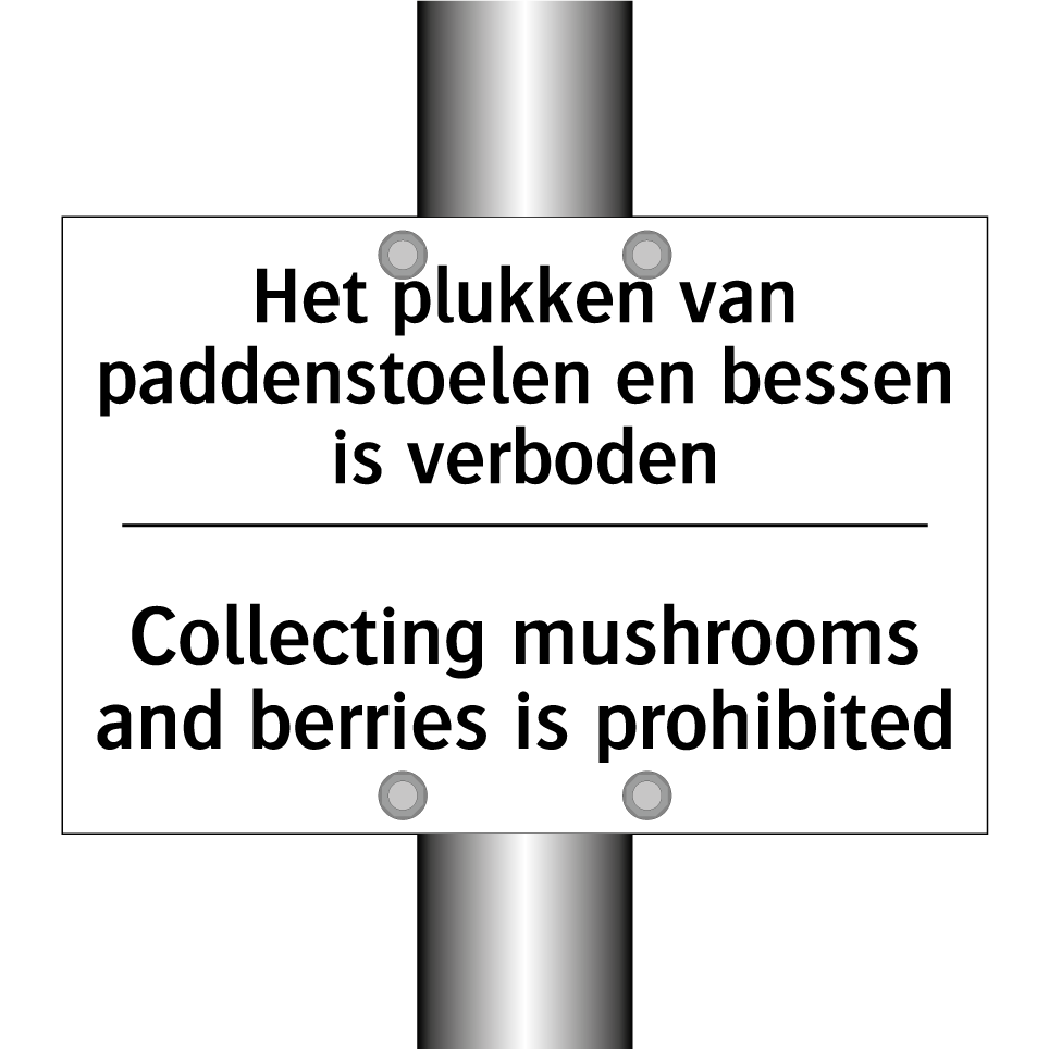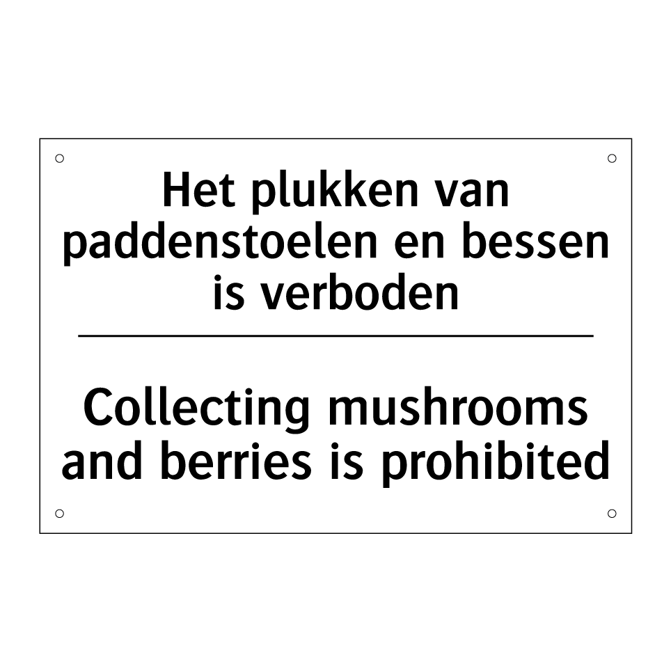 Verbodsbord met de tekst Het plukken van paddenstoelen en bessen is verboden en in het Engels: Collecting mushrooms and berries is prohibited