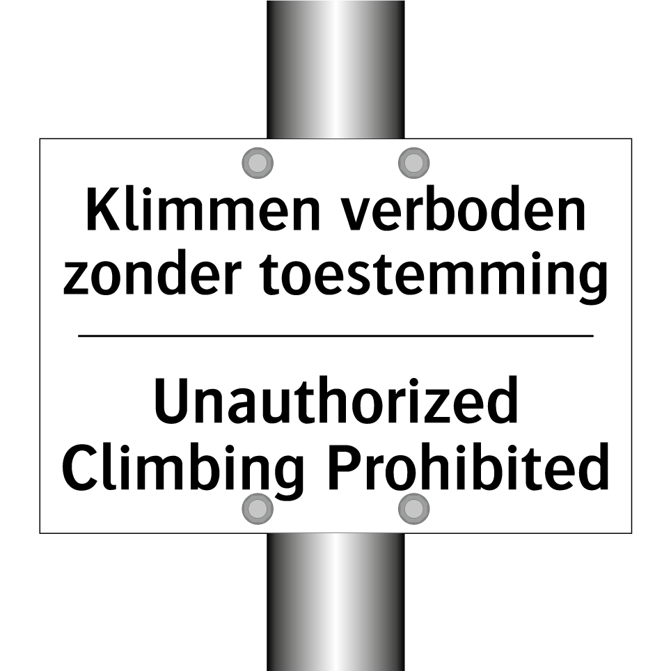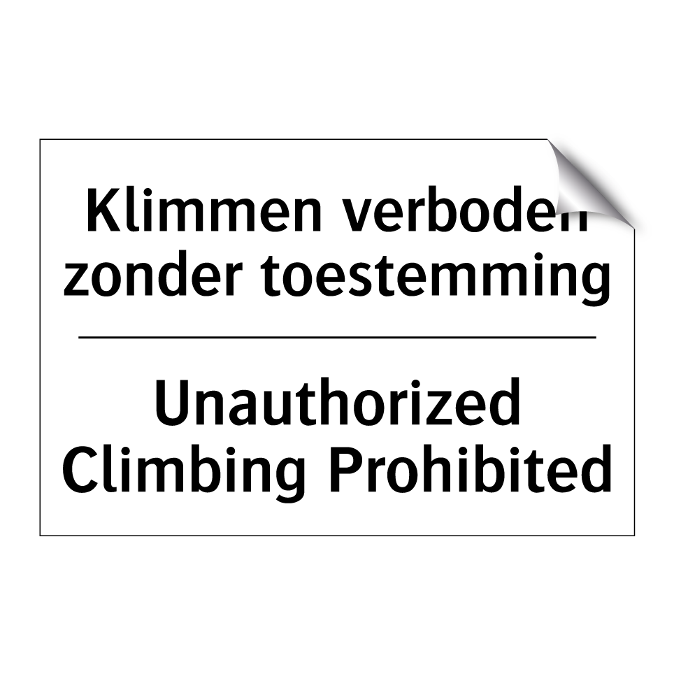 Verbodsbord met de tekst Klimmen verboden zonder toestemming en in het Engels: Unauthorized Climbing Prohibited