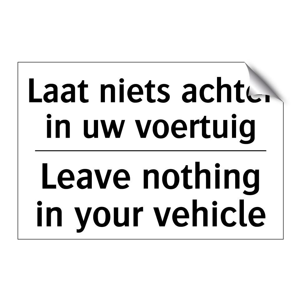 Verbodsbord met de tekst Laat niets achter in uw voertuig en in het Engels: Leave nothing in your vehicle